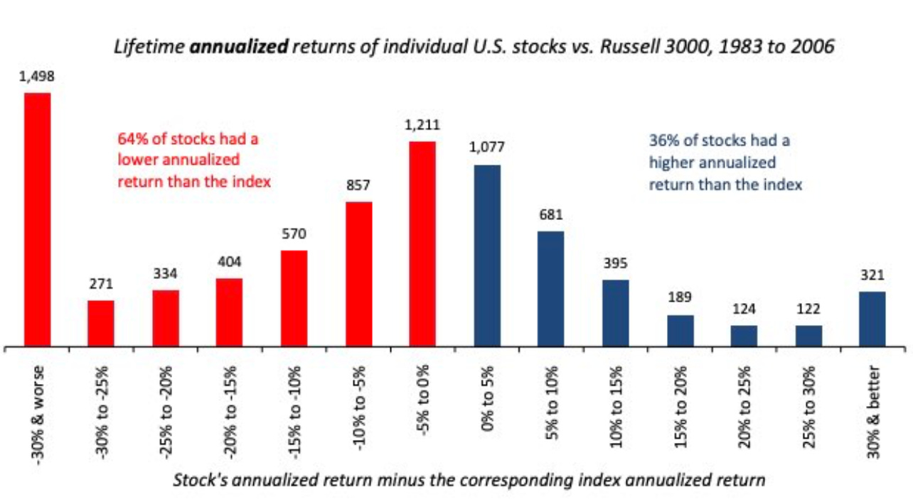 When preparing this letter, and thinking more about this subject, I came back to Meb Faber’s 2008 broader market study titled “The Capitalism Distribution: Fat Tails in Action,” which supports the same geometry: over 23 years of U.S. public market data, 39% of stocks delivered negative lifetime returns, 64% underperformed the Russell 3000, 18.5% lost 75% or more, and 25% of all stocks created essentially all net wealth. Even most winners didn’t stay (public) winners forever – 60% of the companies vanished due to acquisitions.