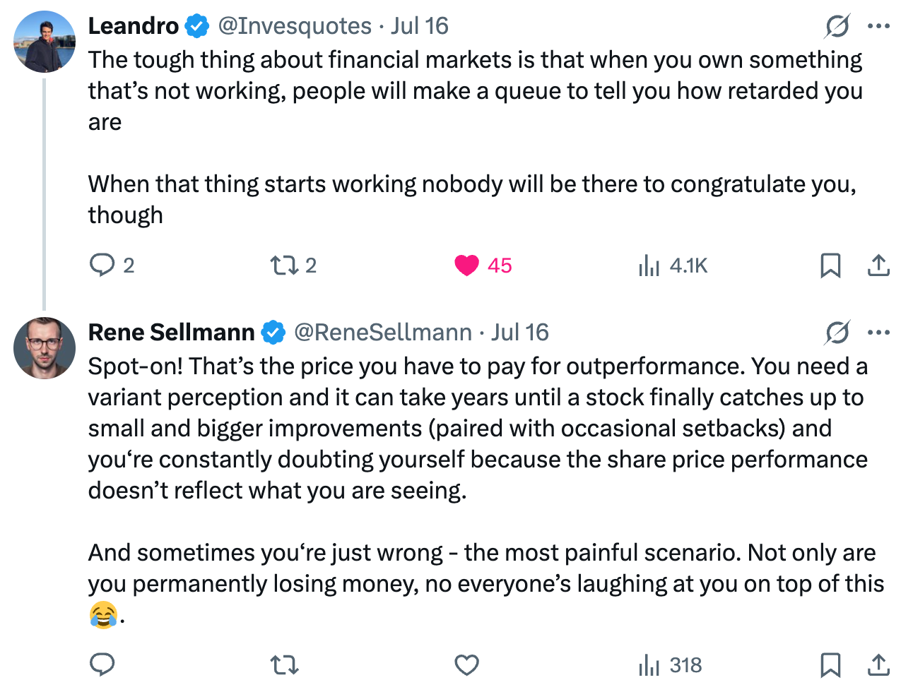 That mindset has real advantages. For one, it reduces noise. There’s less temptation to obsess over whether Q2 margins came in 30 basis points below consensus, simply because there often is no consensus. There’s no sell-side model being tweaked every few weeks. You’re not constantly second-guessing your position based on fickle sentiment shifts because sentiment, in the AIM world, tends to be slower-moving – until it’s not.