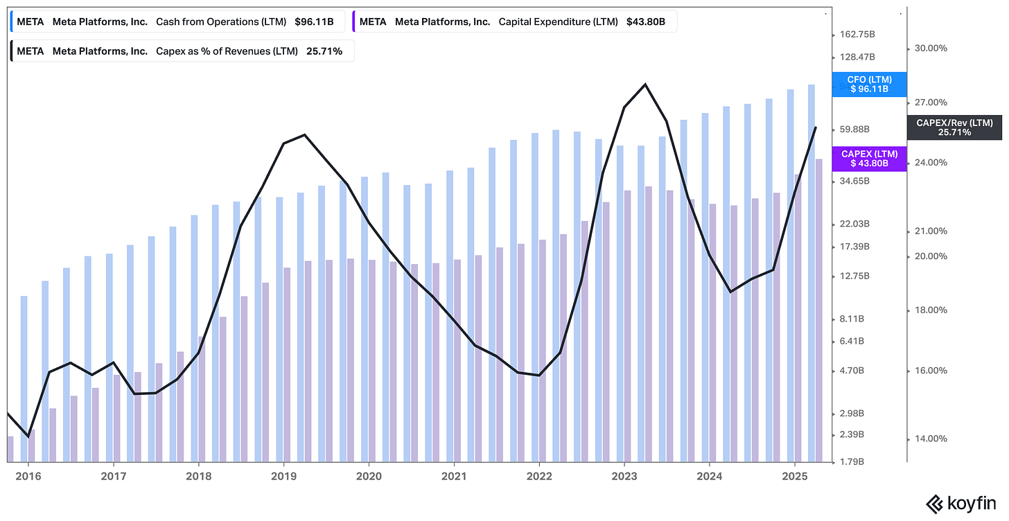 Two years ago, Zuck was 100% convinced the metaverse was the future. He changed the company’s name, poured billions into Reality Labs, and asked investors to trust his vision. That didn’t pan out – at least not yet. Now, he’s equally convinced AI is the future. Again, he’s not hedging. He’s going all-in. Tiho’s point is not that Zuck will fail. It’s that this binary, all-or-nothing approach doesn’t leave much room for error. And when the scale of the bets is $70 billion in capex annually, the consequences of misjudgment are magnified – especially if Meta represents your largest holding.