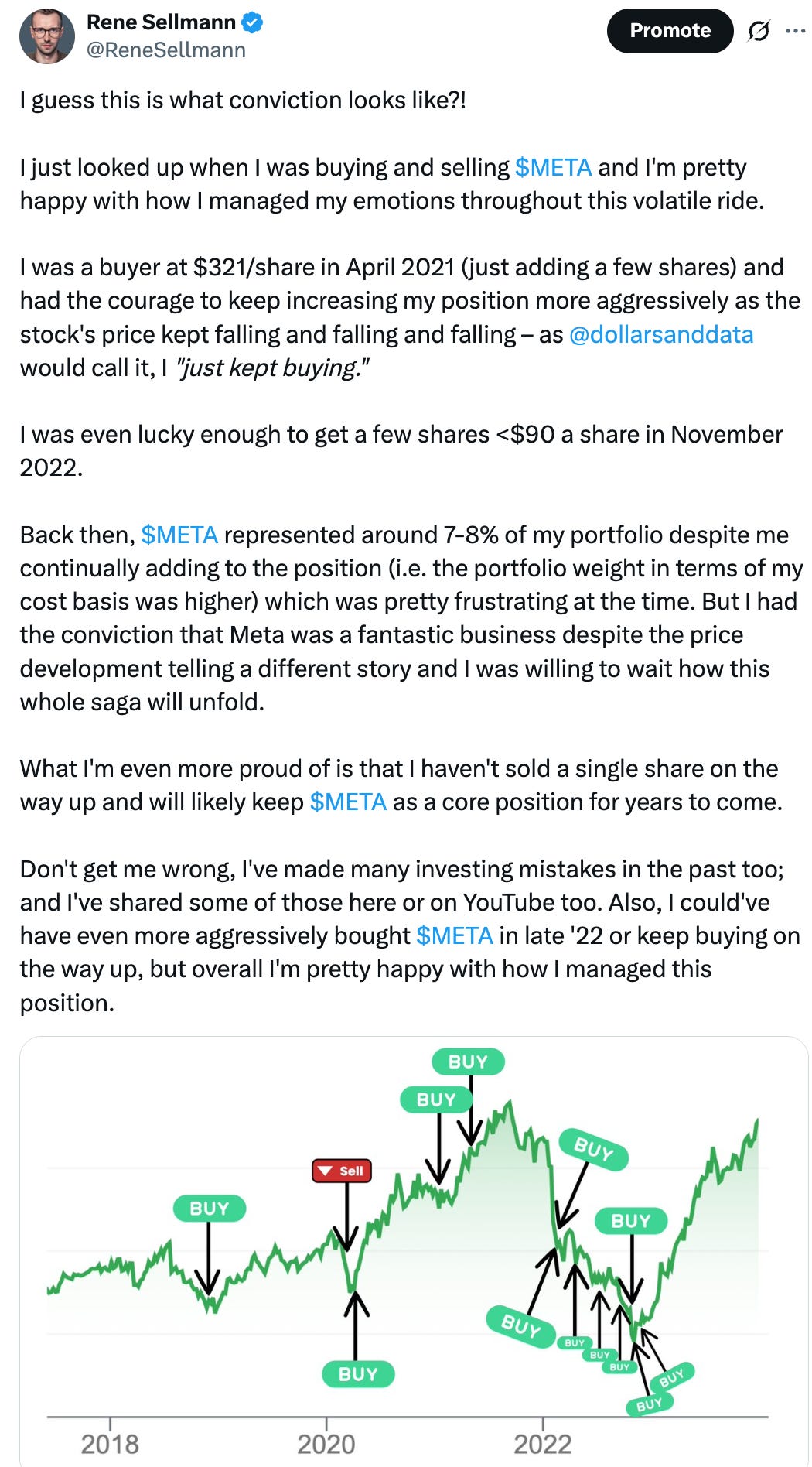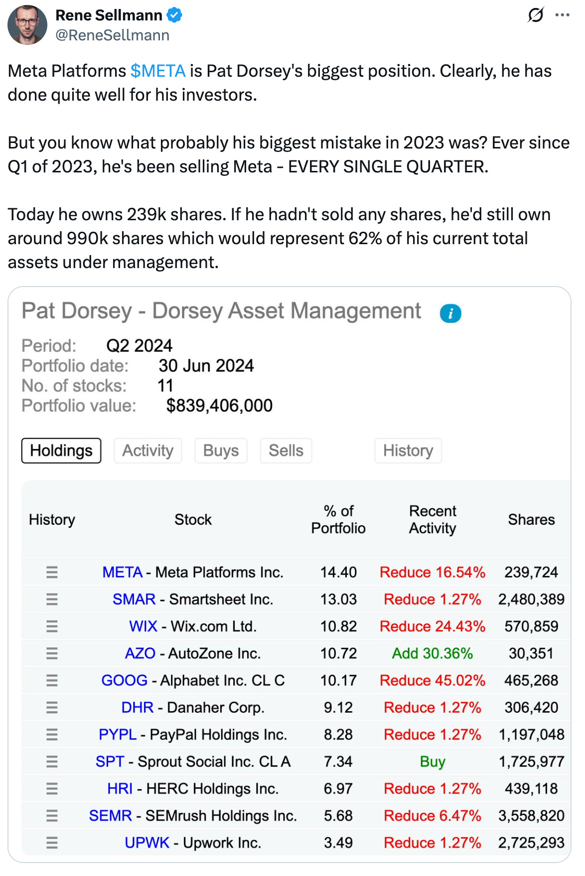 Another reason? Call it cognitive dissonance. I had publicly criticized other investors, like Pat Dorsey, for trimming their Meta exposure too early. Just last August, I posted a thread highlighting how Pat had reduced his Meta stake every quarter since Q1 2023. At the time, I argued that if he’d simply held, he’d still own nearly a million shares, and Meta would represent 62% of his AUM.