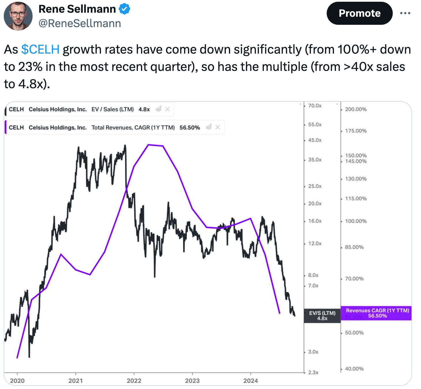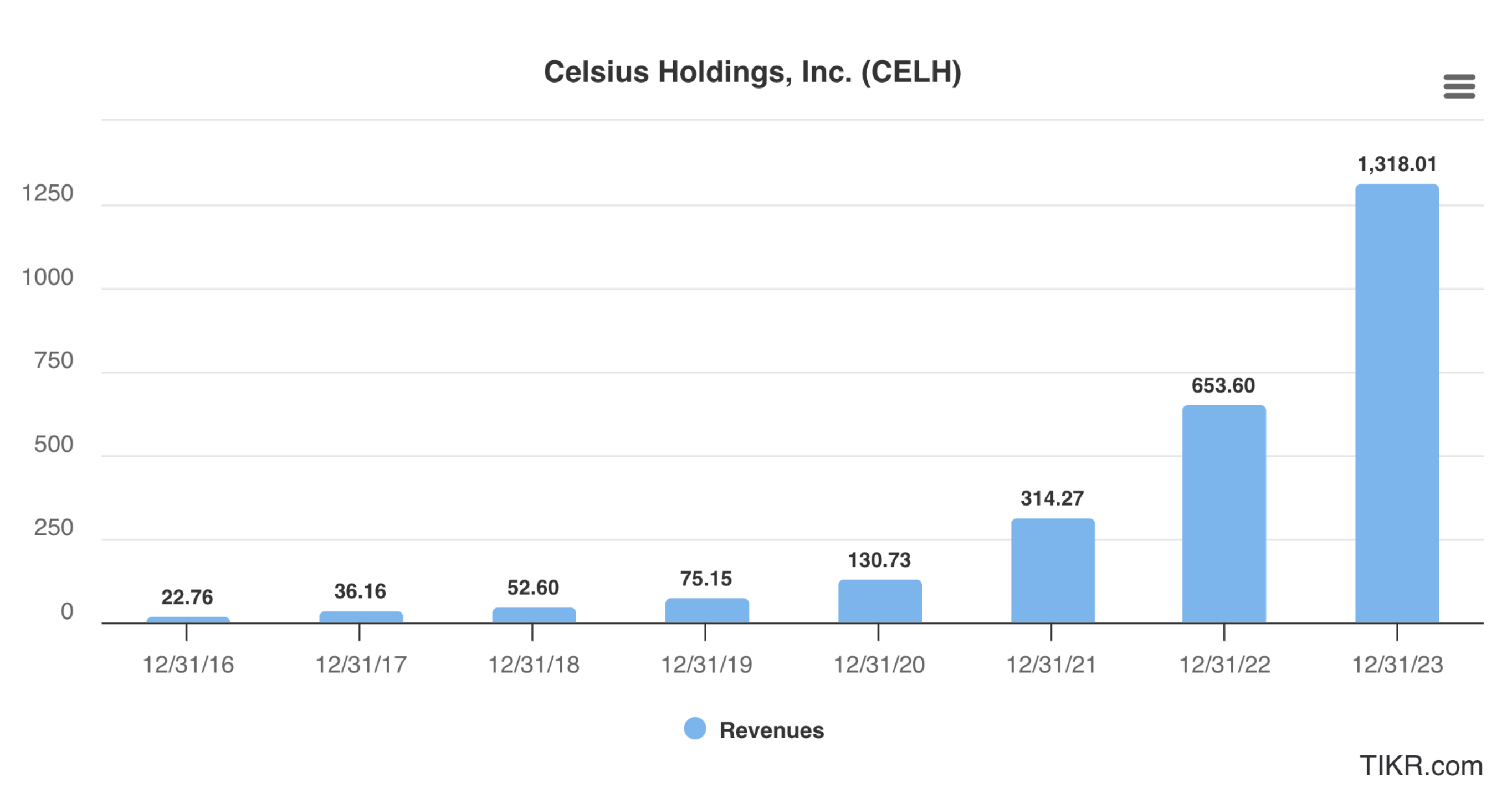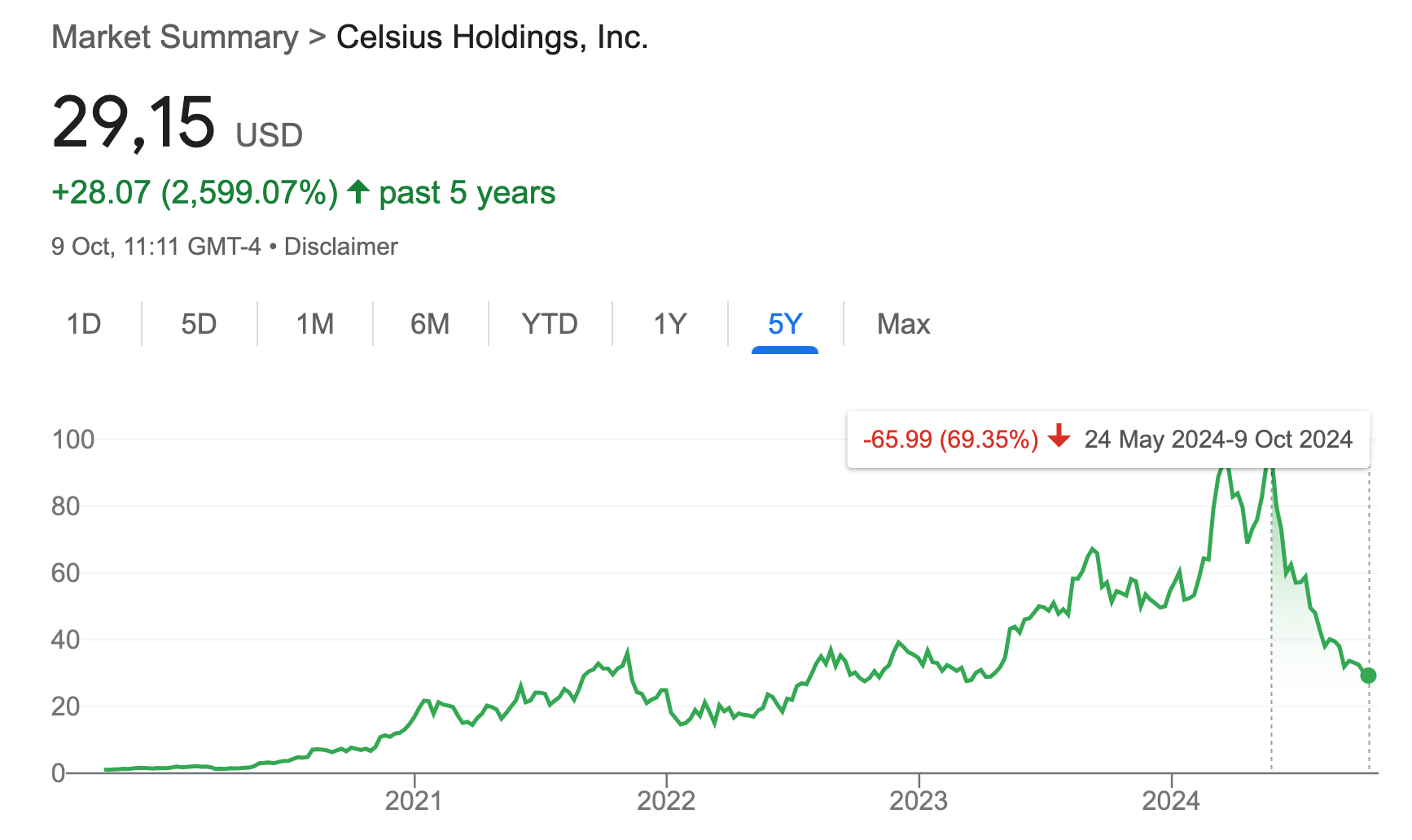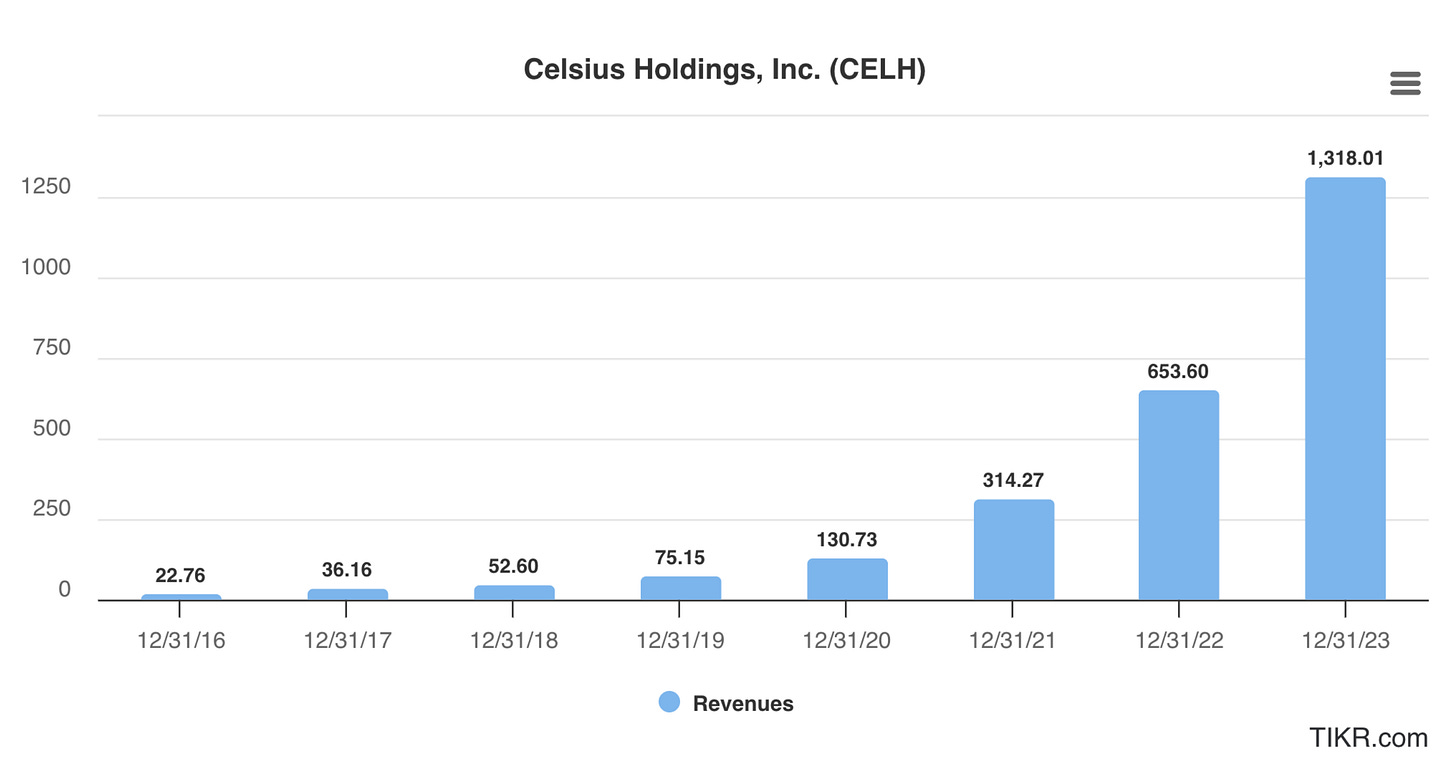 The recent 70% drop in Celsius's stock price has been alarming to many investors, especially given the company’s history of remarkable growth. From just $22 million in revenue in 2016 to nearly $1.5 billion today (over the last 12 months), Celsius's rapid ascent has been nothing short of spectacular.
