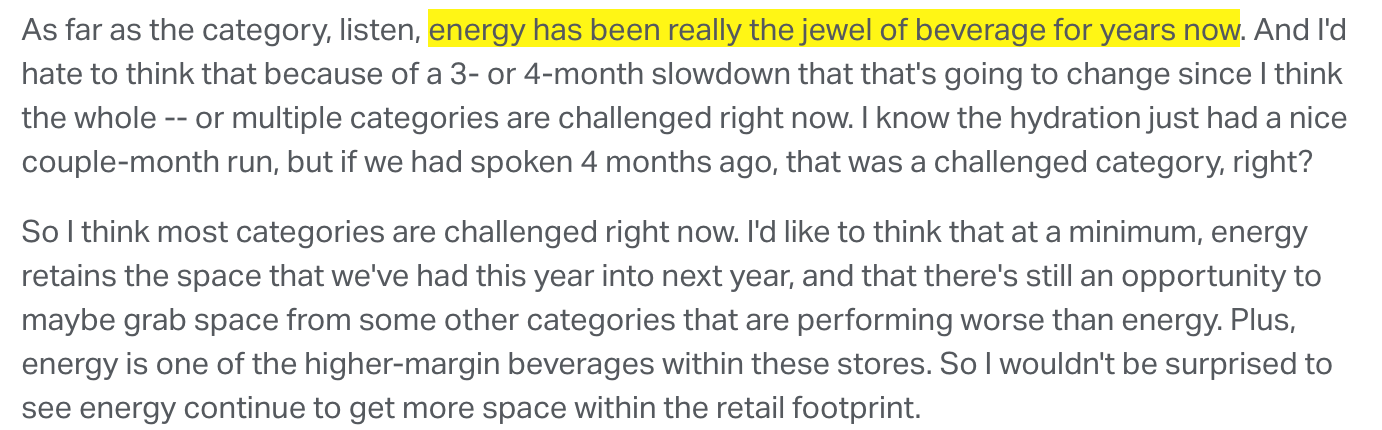 This assertion underlines the immense profit potential and demand stability (which in turn increases predictability) that energy drinks bring to the market.