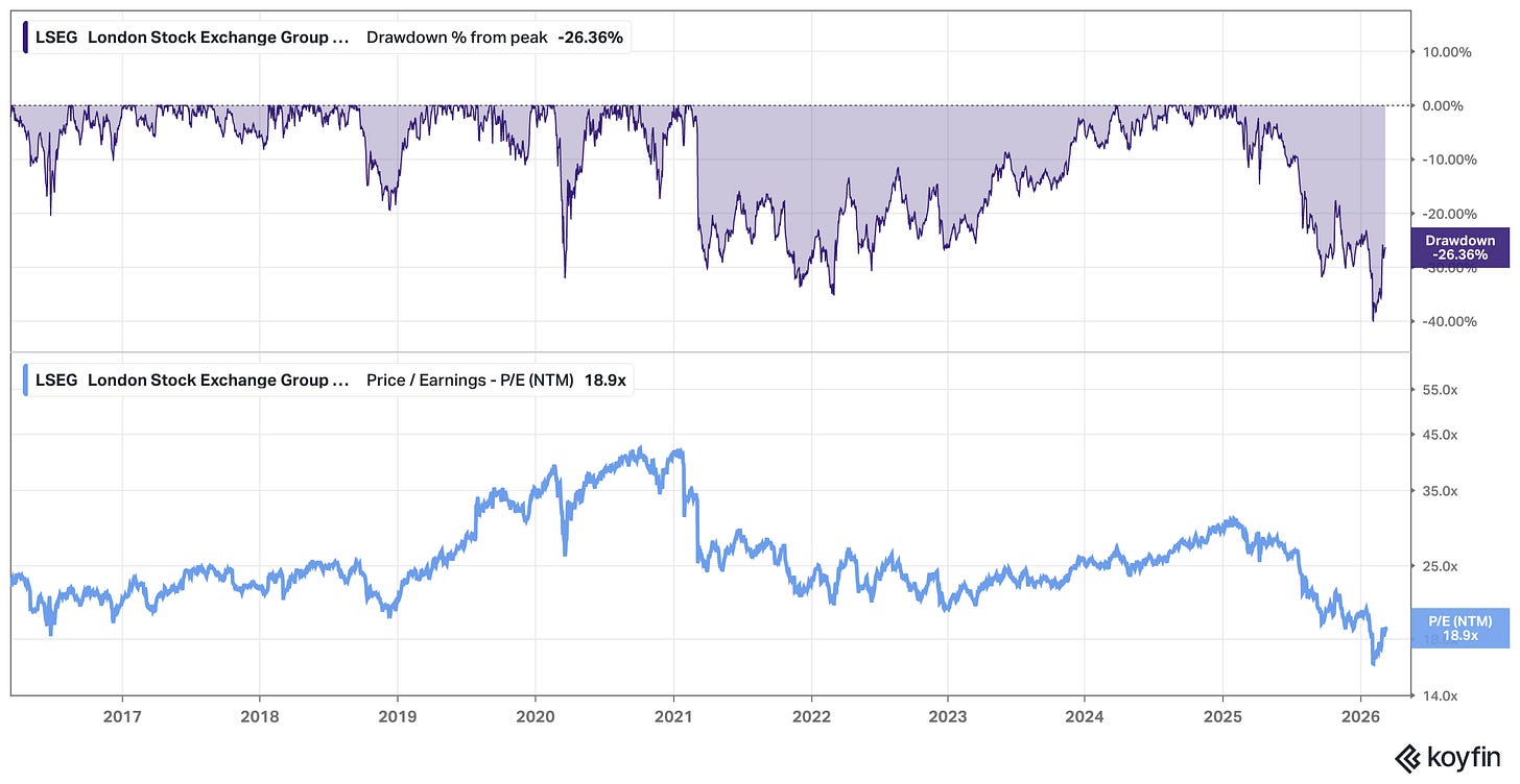 LSEG’s stock price has now also been flat for almost six years, while its NTM P/E has come down from above 40x at one point to 19x now.