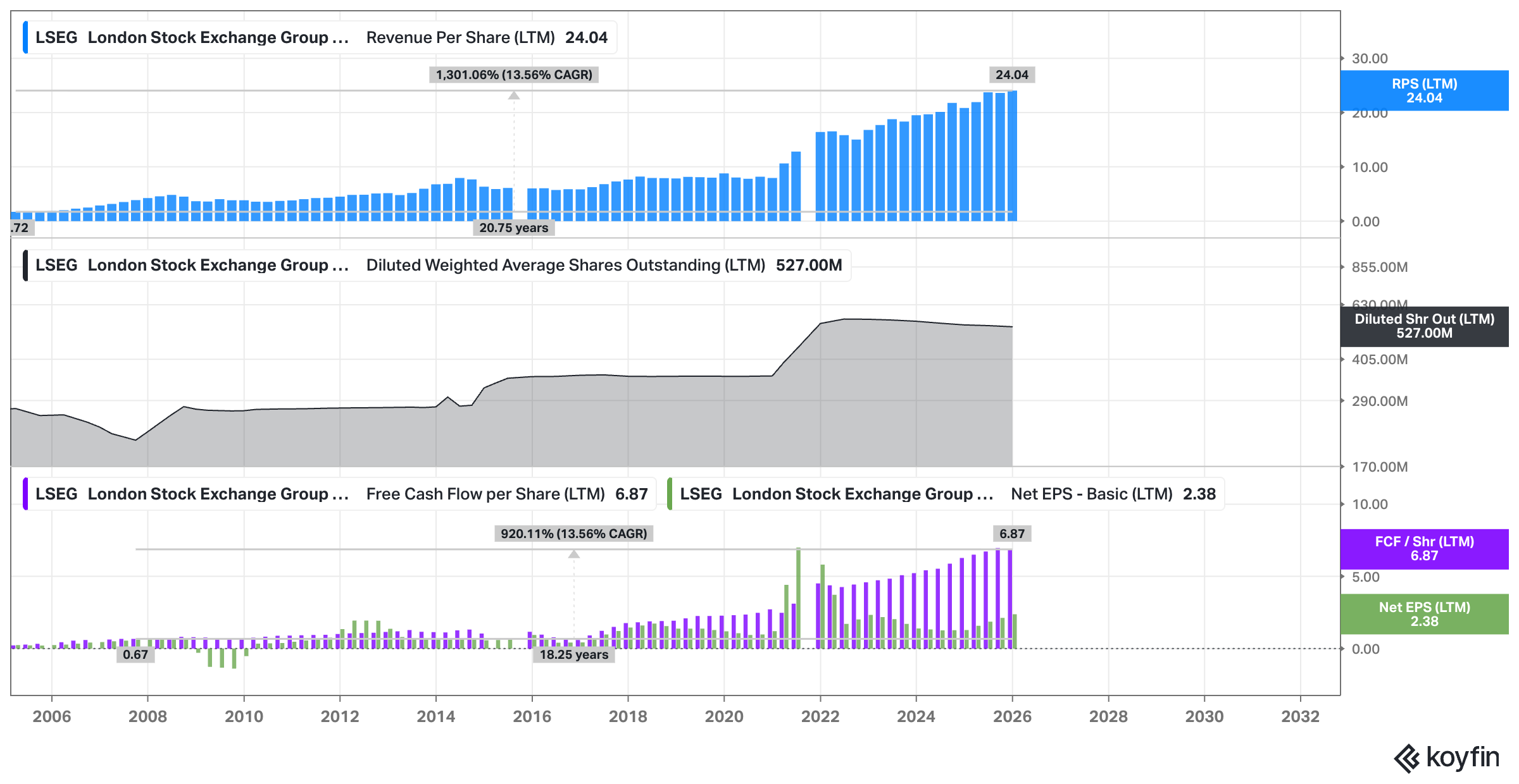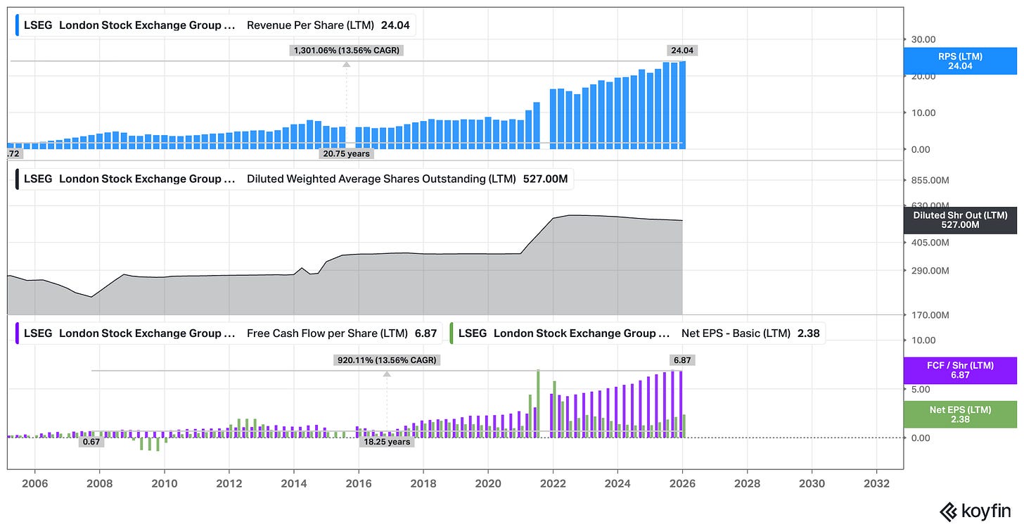 Drawing inspiration from Bill Miller’s famous 90-second pitch approach, we’ll – as always – at first break down five key pillars that could either make LSEG a great business pitch or a cautionary tale of private equity wealth transfer. We’ll also highlight the four key narratives that are dragging the stock down. In short, we’ll build a hypothesis that will then be tested throughout the comprehensive analysis that follows.
