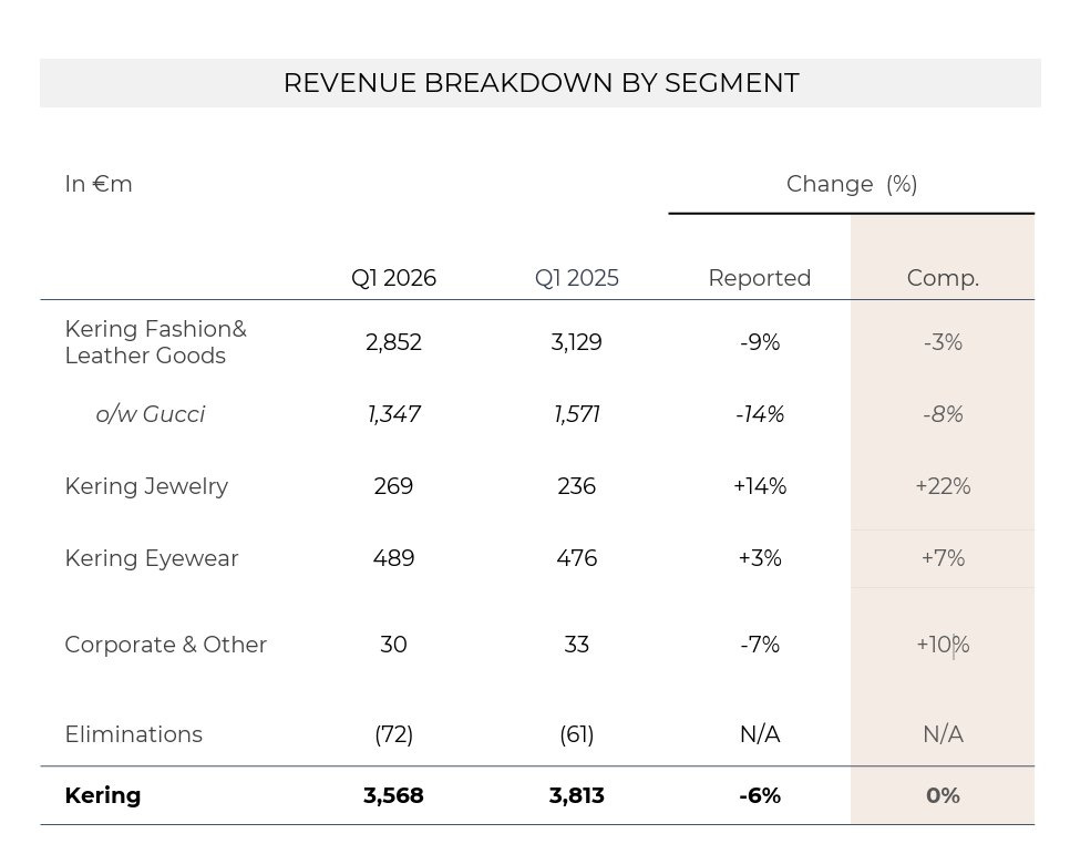 Kering, the industry’s perpetual laggard, also reported yesterday. You could describe the quarter as a period of “stabilization.” There is a massive divergence here though. Jewelry grew by 22%, proving that “hard luxury” is still a preferred store of value for the wealthy.