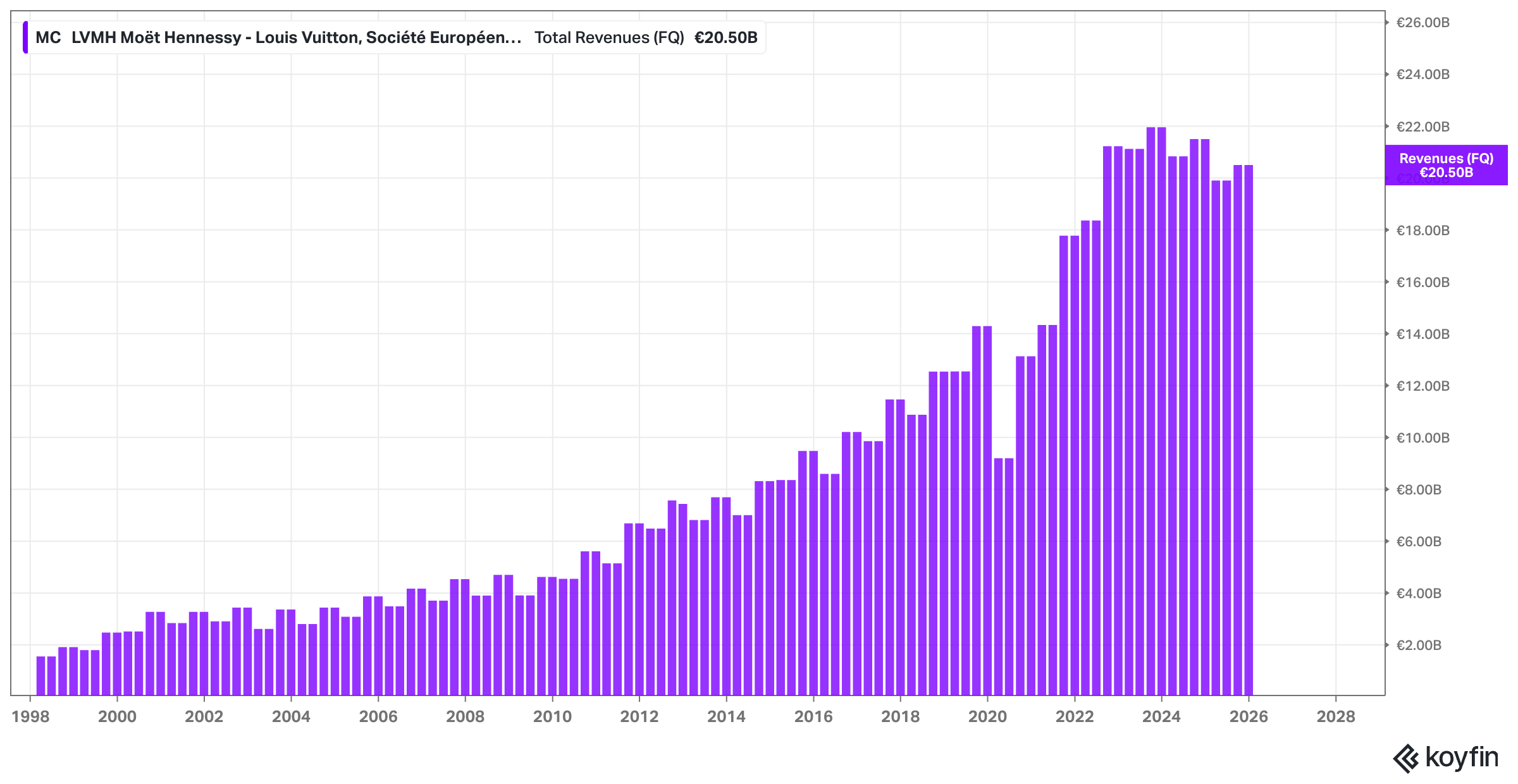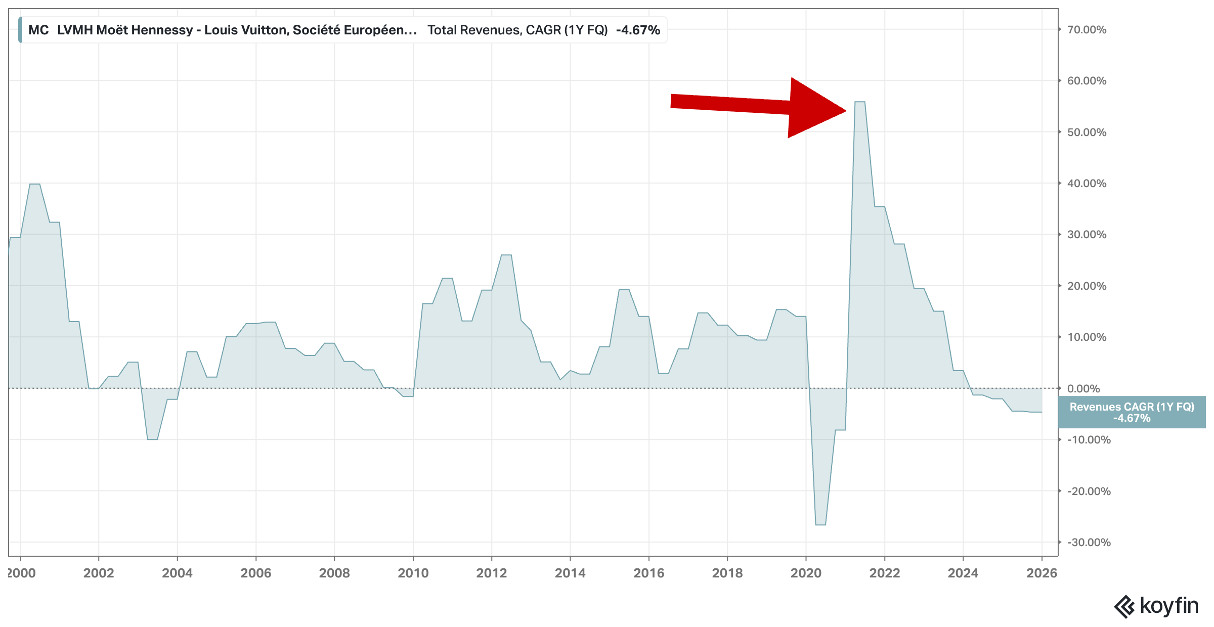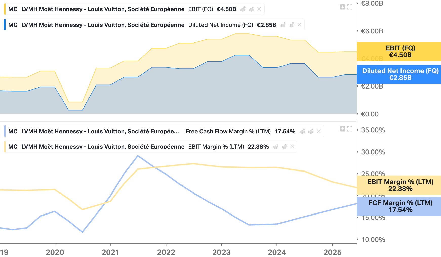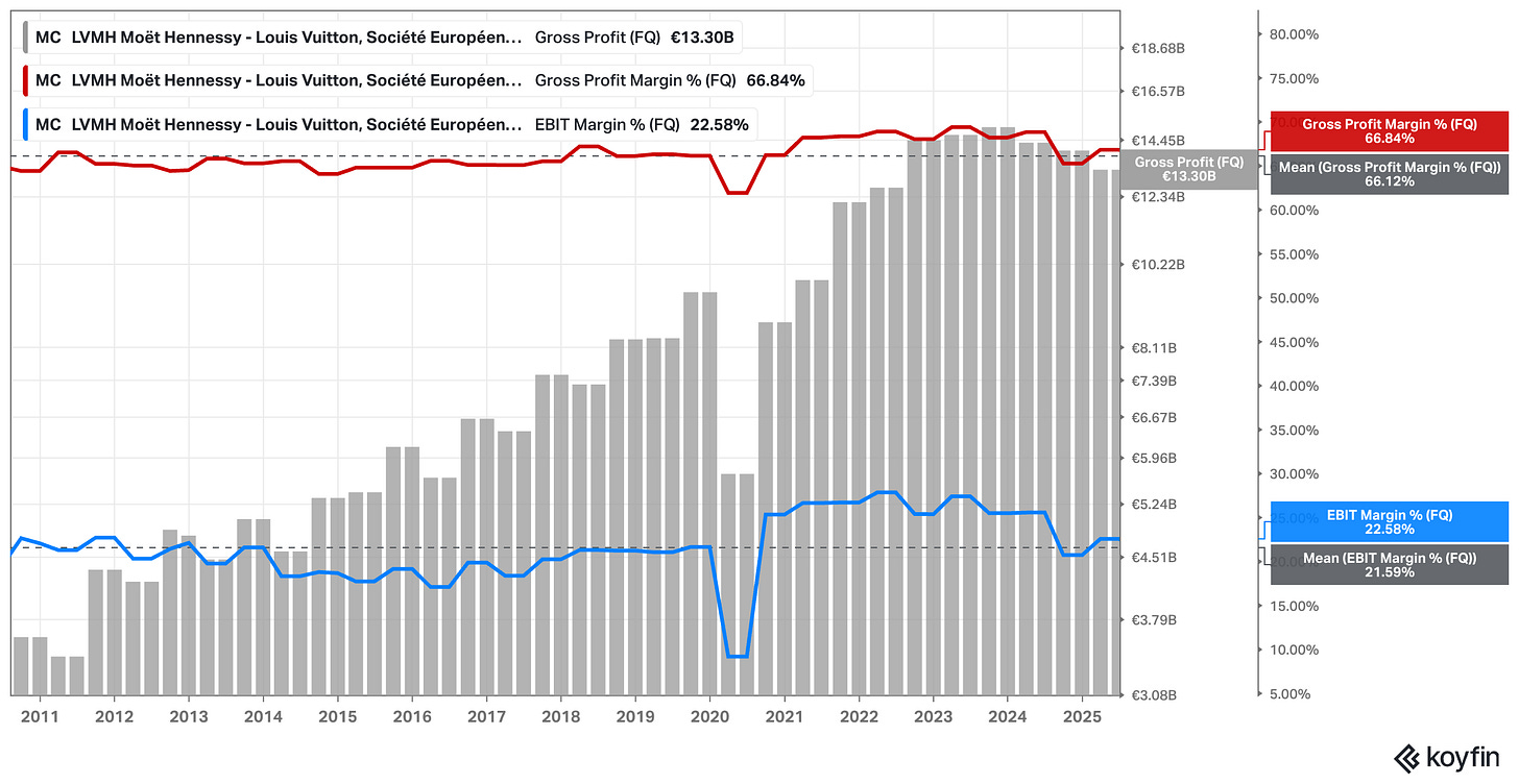 This is a rare, almost unprecedented move for a company that hasn’t seen a one–day drop of this magnitude in two decades, excluding the literal onset of a global pandemic. While organic growth was 6% (yet negative on a reported basis) – a number most peers would envy in the current environment – it wasn’t enough to hide the cracks. France saw a 3% decline, and the Middle East fell by 6%. The myth of “absolute pricing power” regardless of any macro backdrop is finally being tested. When even the UHNWI Birkin bag crowd starts to hesitate, you know the environment has turned challenging.