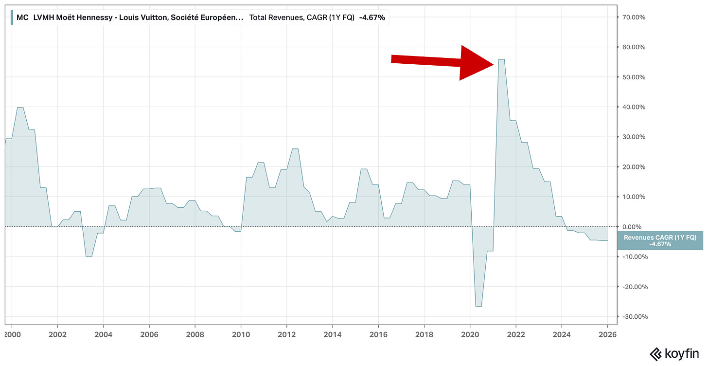 LVMH is not an island. To understand the current stagnation, you have to look at the broader wreckage across the sector. I’d argue that for around three years (mainly during the 2021–2023 period), the luxury industry benefited from a massive pull–forward of demand – a pull-forward demand cycle. We are now witnessing the formation of a consumption “black hole.” This is the natural hangover that follows a period where “aspirational” buying became almost a mania – or a way to cope with Covid and its aftermath? Even the most resilient players – yes, I’m looking at you Hermès – are now showing signs of fatigue.