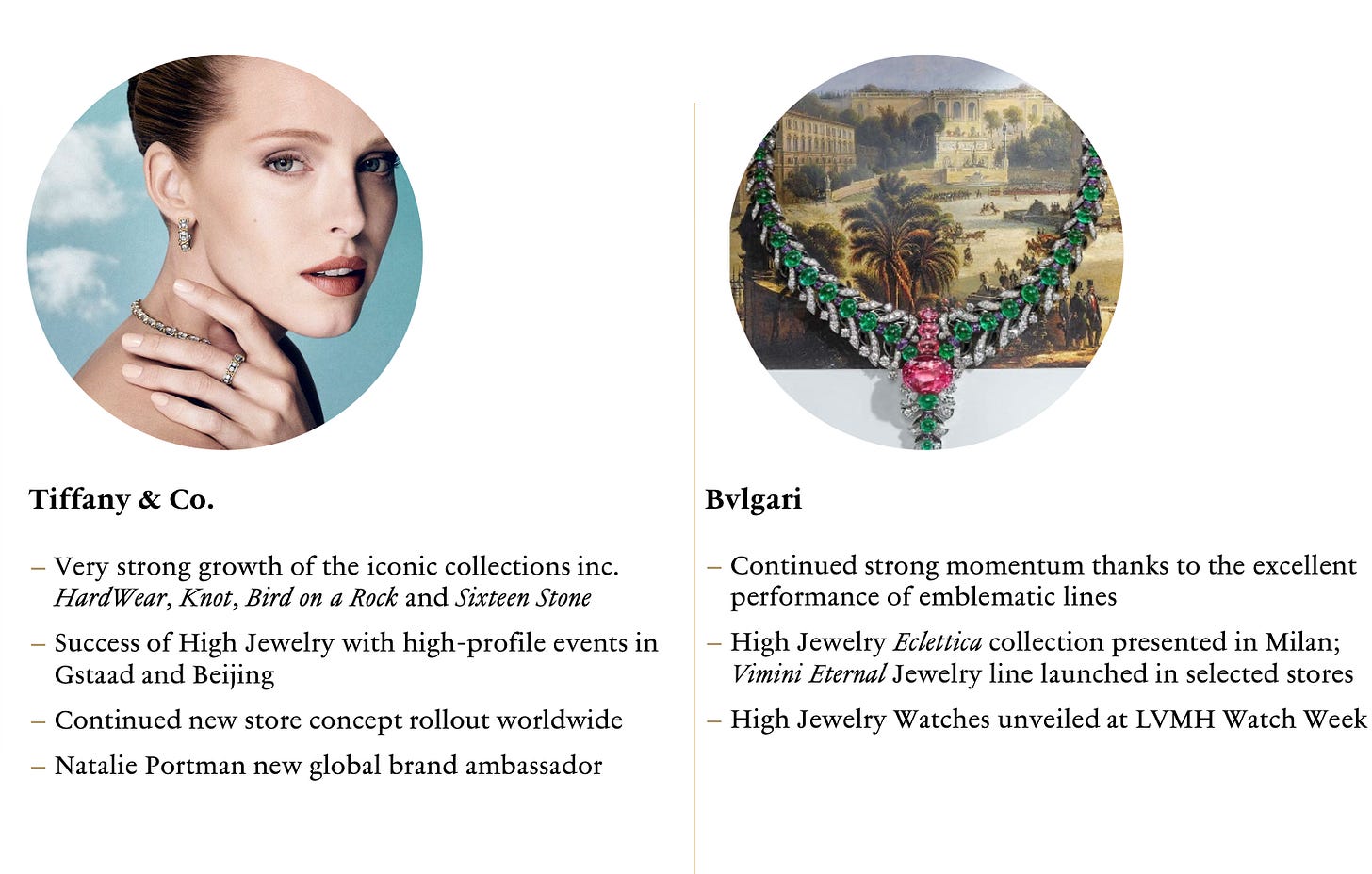 “The Maison [Tiffany] continued to successfully renovate its store network and strengthen its iconic product lines, with HardWear in particular posting very strong growth. Highlights of the quarter for Tiffany included the launch of a marketing campaign featuring its new global brand ambassador, Natalie Portman, and its latest high jewelry collections being showcased in Gstaad and Beijing.
