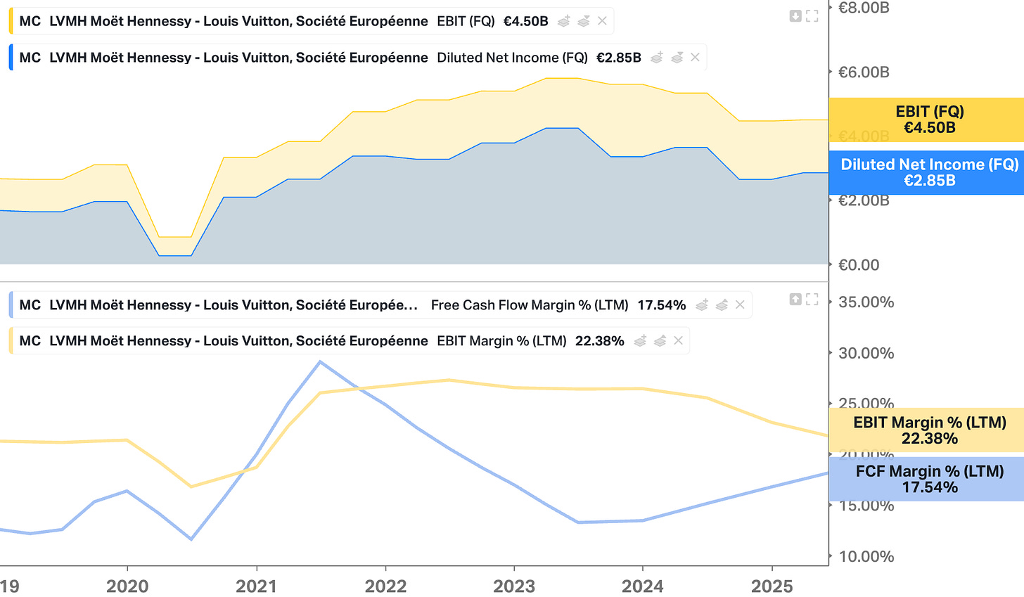 This is a significant yellow flag for a division that has historically been the bedrock of the company’s valuation. It is the first time in recent memory that we are seeing a sustained period where the brand heat of Louis Vuitton and Dior isn’t translating into growth (excluding the 2020 COVID quarters).