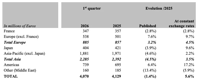 The geographic data tells a story of shifting dependencies. Asia excluding Japan remains a bright spot with 7% organic growth – the best quarterly performance really since the end of 2023 –, while the United States showed a decent start to the year at 3% (both geographies signaling a reacceleration QoQ).