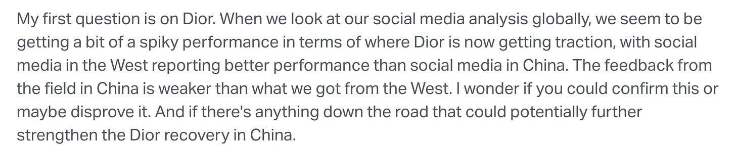 “[…] it’s the best quarter since 2023. And it’s good because it’s broad-based. One thing to -- maybe to notice is that also Sephora is flat this quarter on the Asia cluster and especially China, which was one of the geographical areas that we were fixing for Sephora. So it’s good to see that it’s rebounding.“ - Earnings Call