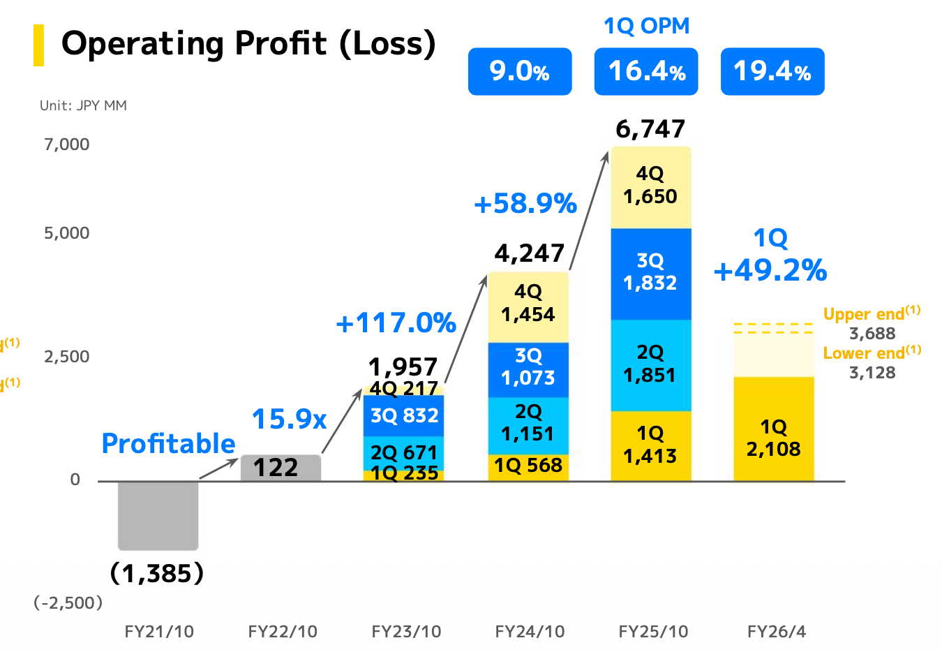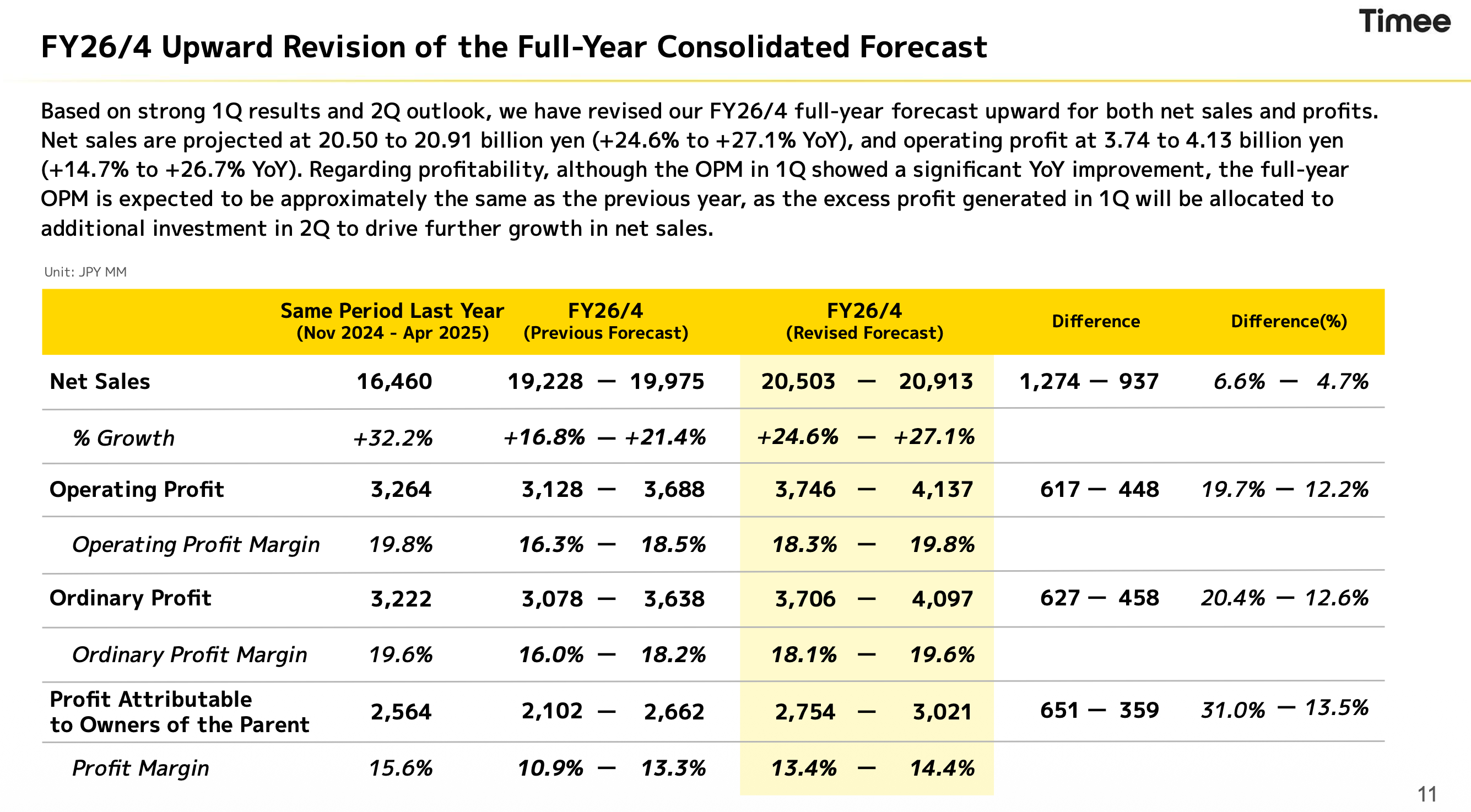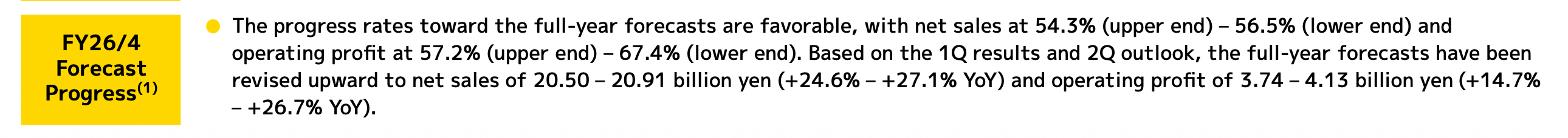 The revised forecast now projects net sales of JPY 20.5 billion to JPY 20.91 billion, reflecting an increase of 24.6% to 27.1% YoY, and operating profit of JPY 3.74 billion to JPY 4.13 billion, an increase of 14.7% to 26.7% YoY.