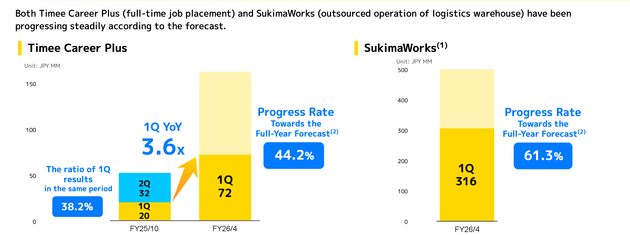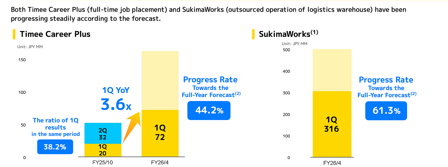 SukimaWorks: This logistics warehouse outsourcing business, now fully consolidated into Timee, reported ¥316 million in revenue for Q1 and is progressing smoothly toward meeting its full-year target.