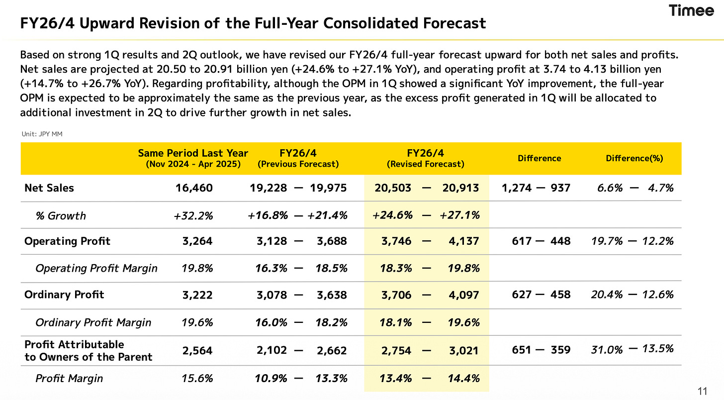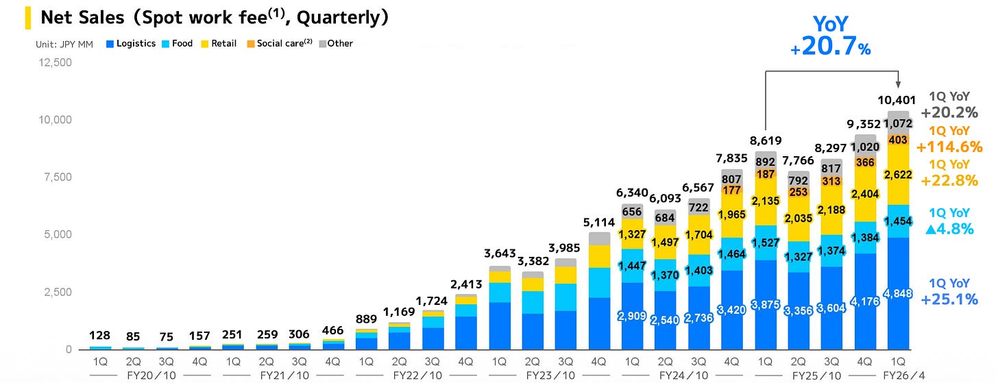 However, Timee’s impressive Q1 results, upward revision of guidance, and strategic diversification into sectors like social care, long-term hiring, and full-time placement services are a clear indication that growth is far from stalled. I’ve attached the quarterly YoY growth rates below - in Q1 growth reaccerlated.