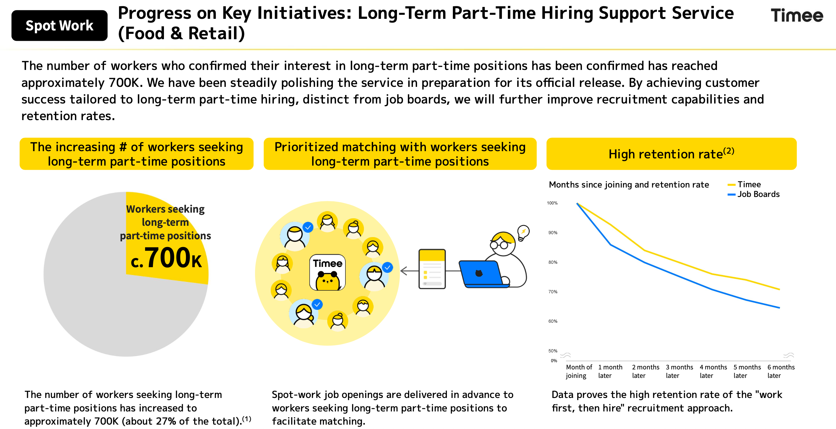 “What we are offering is that if any business is willing to hire people for the long term, we open up an additional matching service. They can use the existing spot work service as a one-time trial, and if both sides like how the trial goes, it evolves into a long-term position. This is the way we offer the benefits that job boards offer... especially in this long-term market, our advantage is the fact that they can use Timee as a one-time trial before actually hiring somebody.”