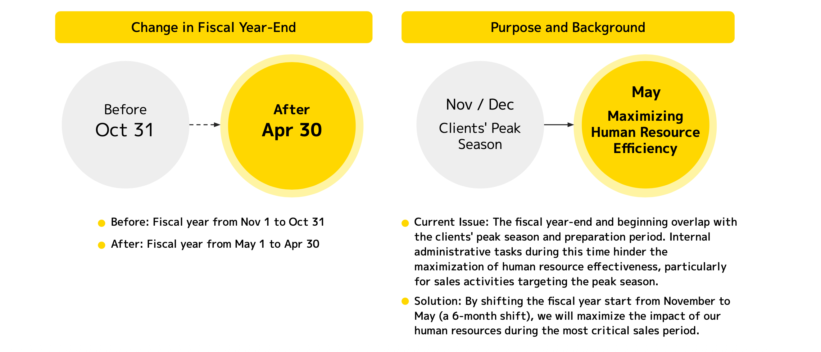 “The reason background behind this is... the year end is a busy season not only for the logistics but also for the food and retail including Christmas sales period which is a crucial timing for everybody to make money. On the other hand, when the fiscal year ends in October, November and December coming, it becomes challenging internally for us within the company to handle the start of the period response and also the various administrative tasks. So the challenge was the crucial critical timing when we needed to have the greatest impact. We were unable to fully maximize the resources available. So this time we have decided to shift the fiscal period by half year to ensure we can properly allocate resources to engage with the customers."