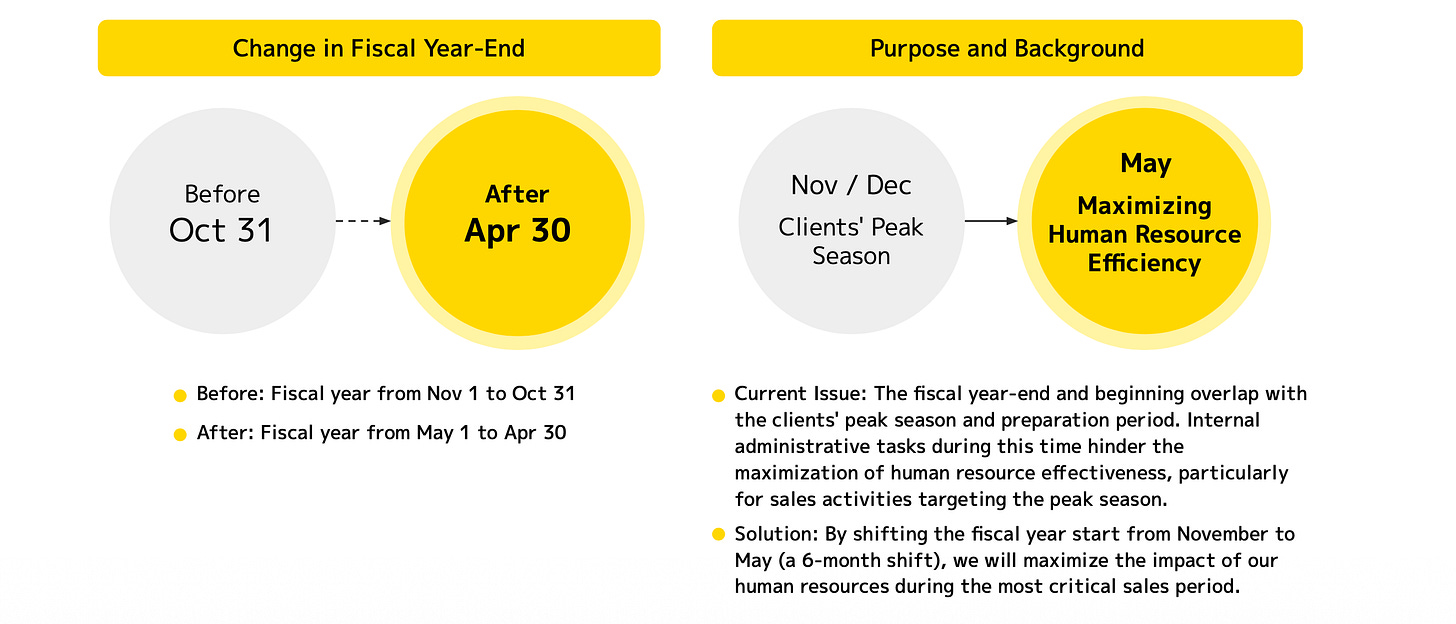 CEO Ryo Ogawa explained that the previous fiscal year-end, in October, created internal challenges, particularly during the November and December months, when the company struggled with handling the transition period’s administrative tasks while still preparing for the peak season ahead. As Ogawa put it: