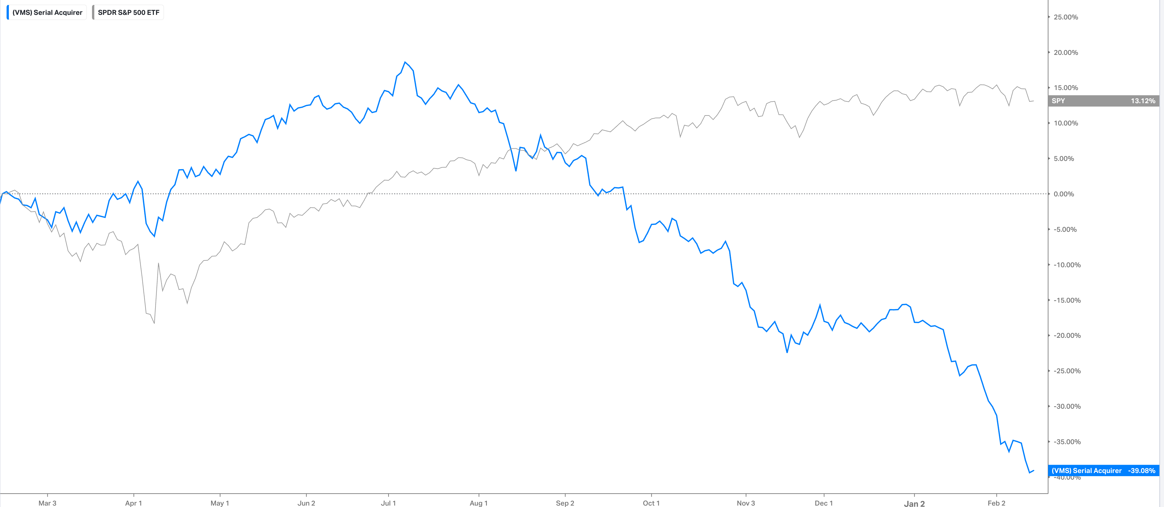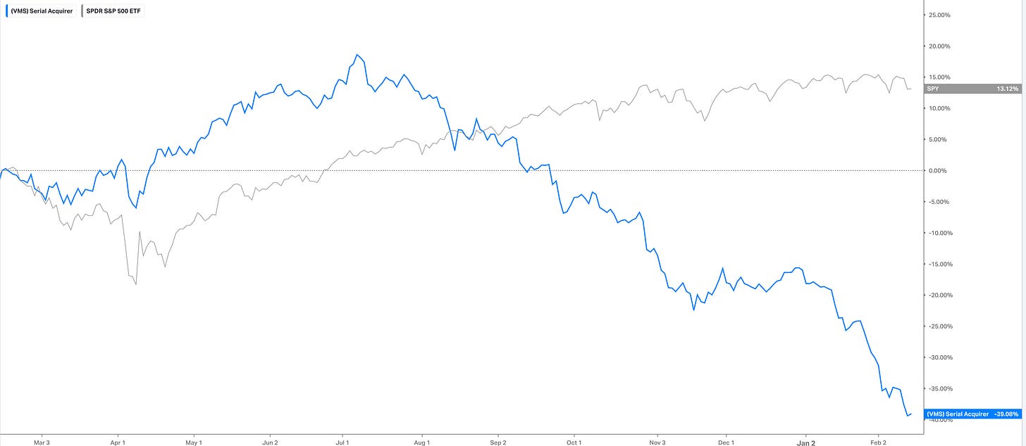 Yet, my equal-weight basket of VMS-/software-focused acquirers (Chapter Group, Lumine Group, Topicus, Roper Technologies, Constellation Software, and Vitec Software) also underperformed the market by a large magnitude (an even bigger one).