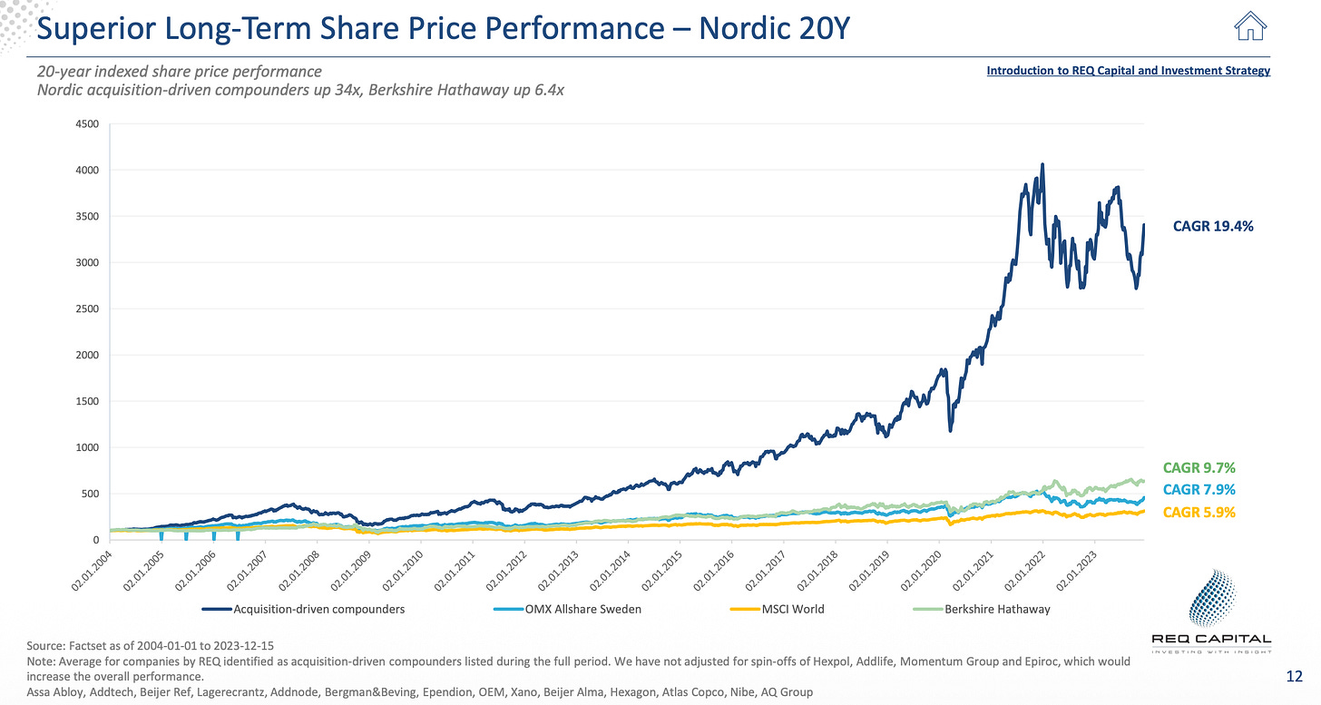 “If compounding had a soul mate, it would be the group of compounders in this book. Their power lies in their ability to perfect two engines of growth: organic reinvestments and programmatic acquisitions of small private companies. These dual engines provide a unique level of capital deployment that single-engine companies, relying only on organic growth, can rarely match. Unlike companies tethered to a single industry or market, they operate across a broad landscape, unconstrained by sector or geography. The global SME (small and medium-sized enterprise) market is their playground, offering a virtually endless runway of opportunities. Additionally, what truly sets compounders apart is their ability to sustain this growth over the long term. […]“ - The Compounders: From Small Acquisitions to Giant Shareholder Returns