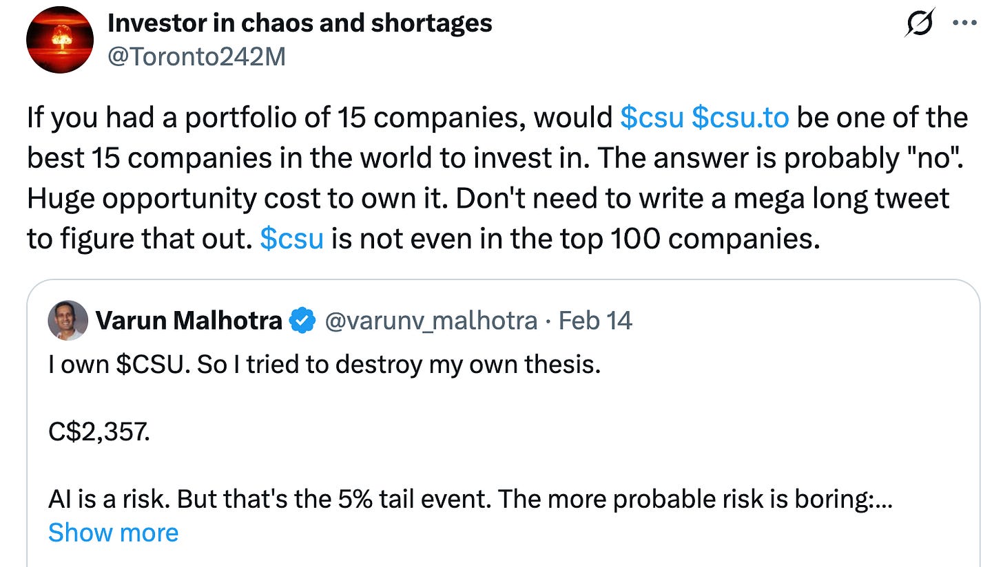 “Also worth noting, the IRR dispersion for CSI’s small acq is greater than on the larger deals and investors now view the dispersion as even wider (and hence, greater uncertainty but hard to understand what’s priced in on that front). The quality of the additions in their acq funnel has already come down (versus the first 700 acquisitions) but that’s not necessarily a bad sign.” - A comment from The Compounding Tortoise below a recent Substack note