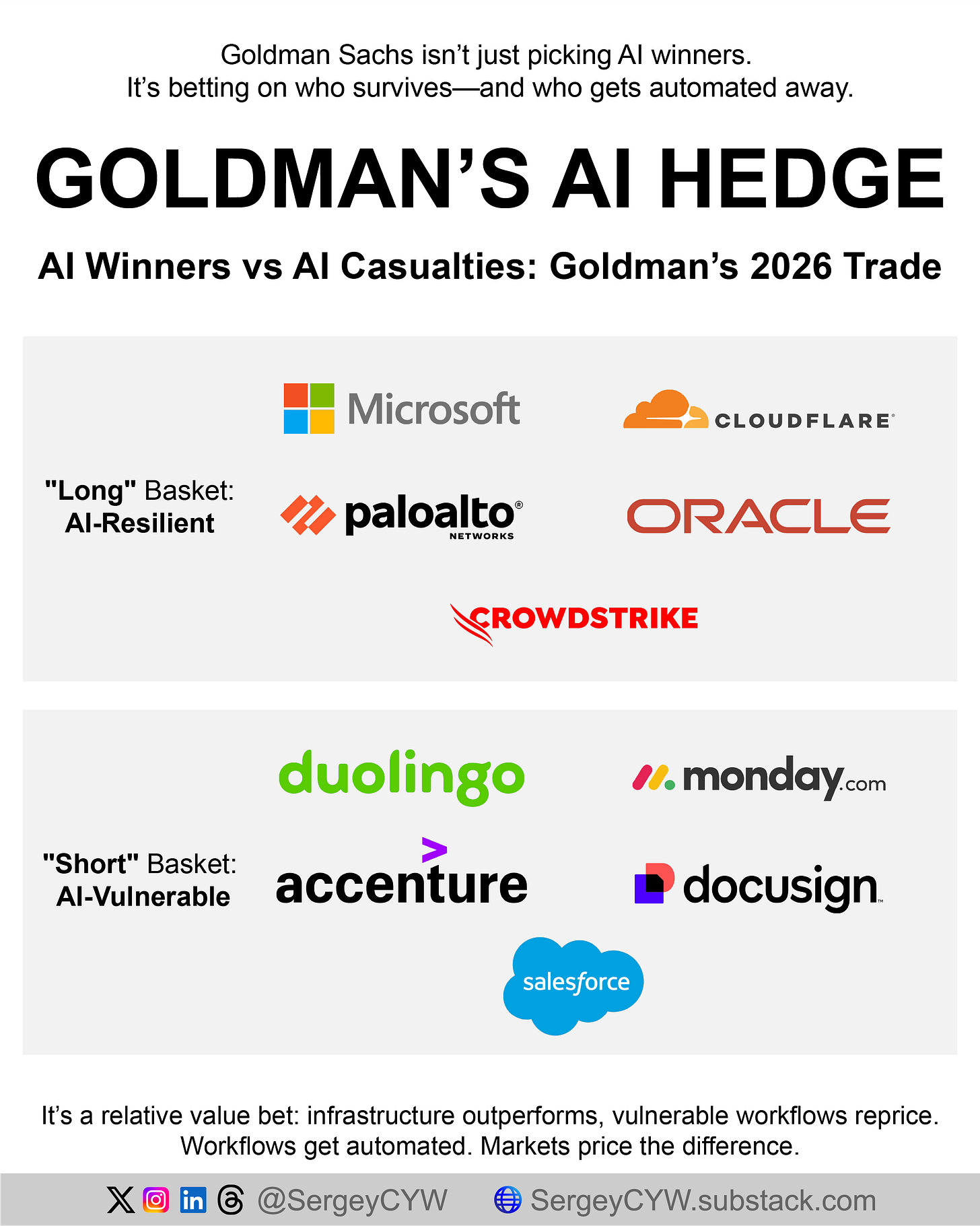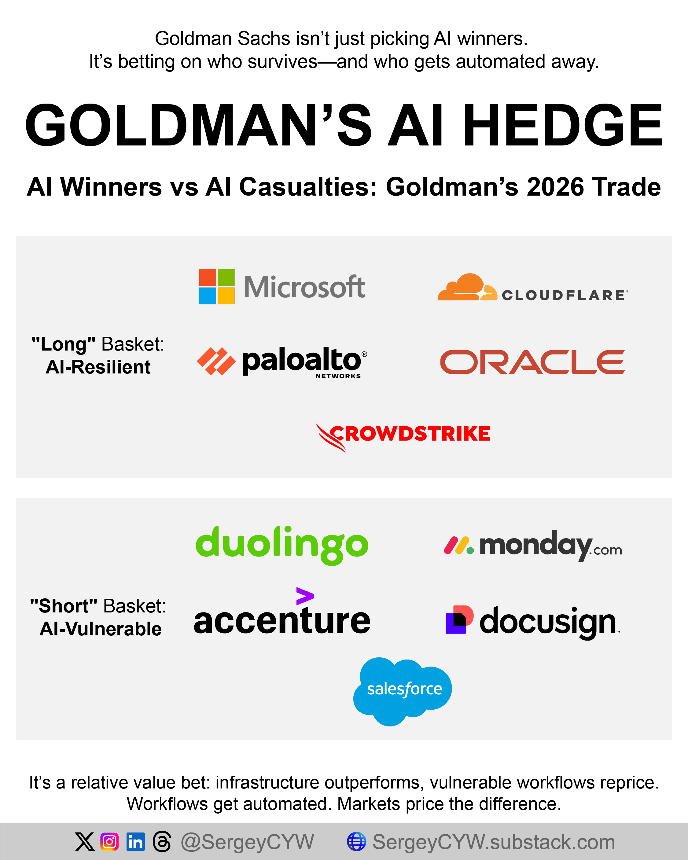 In the broader SaaS market, the fear of AI disruption is real. AI tools could potentially replace simpler, off-the-shelf software solutions like Monday.com or Salesforce systems, learning platforms like Duolingo, or communication platforms (like Zoom). Goldman Sachs, in fact, proposed the following long- and short-baskets: