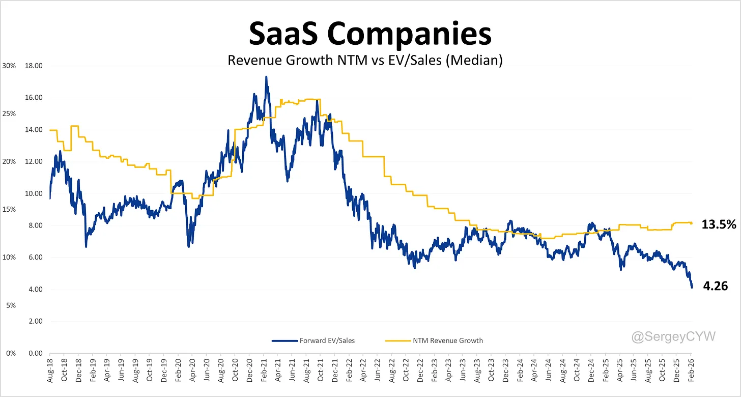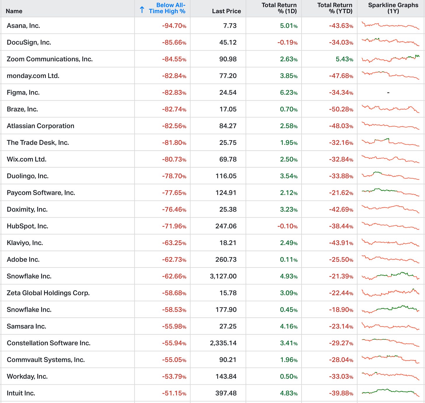 The software space, and specifically the SaaS industry, is currently experiencing what some are calling the “SaaSpocalypse” or “SaaSmaggedon.” The valuation of software companies – especially those in the SaaS category – has taken a BIG hit, and the market seems to be in the midst of a major reset. A lot of the high-growth, high-valuation software stocks have been hit hard, as we can see in the three charts below. Software stocks have experienced huge declines, particularly in the past year, as AI-driven fears, coupled with broader economic pressures, pushed valuations lower across the board. And arguably to levels that now make an entry attractive.