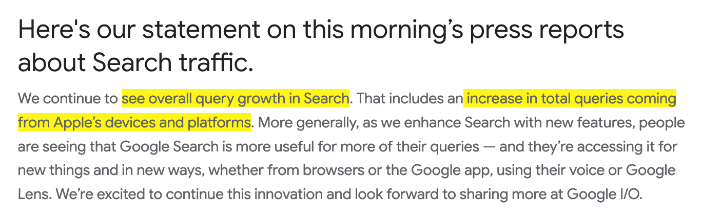 In an unusual move, Google publicly countered the claims by stating that overall search queries continue to grow, including those from Apple devices. Notably, however, the company did not address the specific decline in Safari searches; make of this whatever you want ;-) …