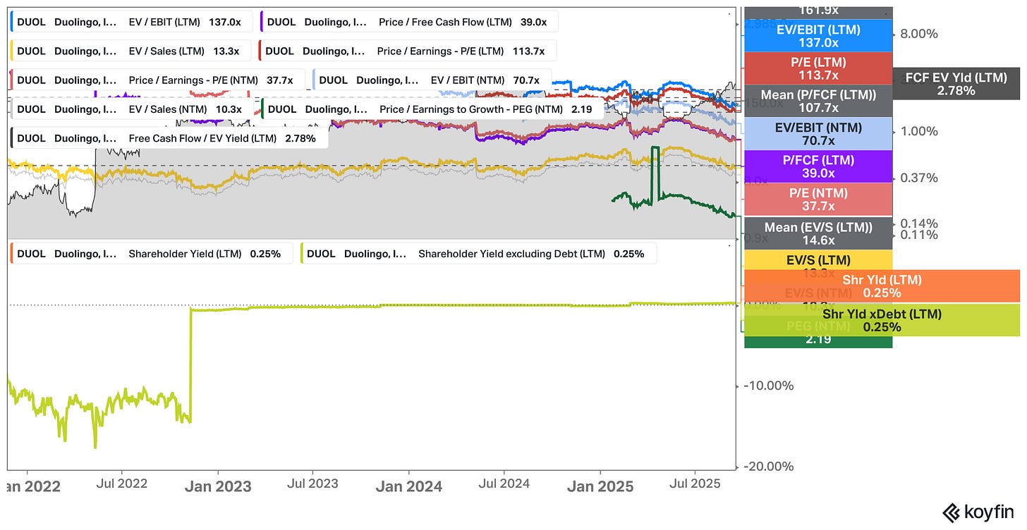 The free cash flow yield tells another part of the story. At under 3%, it’s thin – especially when you consider what else investors could earn in today’s interest rate environment. Shareholder yield, at just a quarter of a percent, reflects the fact that Duolingo is reinvesting most of its cash back into the business rather than paying dividends or buying back stock. If the company were to initiate a dividend, it would show up in the lower part of this chart, alongside buybacks, giving a quick visual of how much capital – relative to the current price – is being returned.