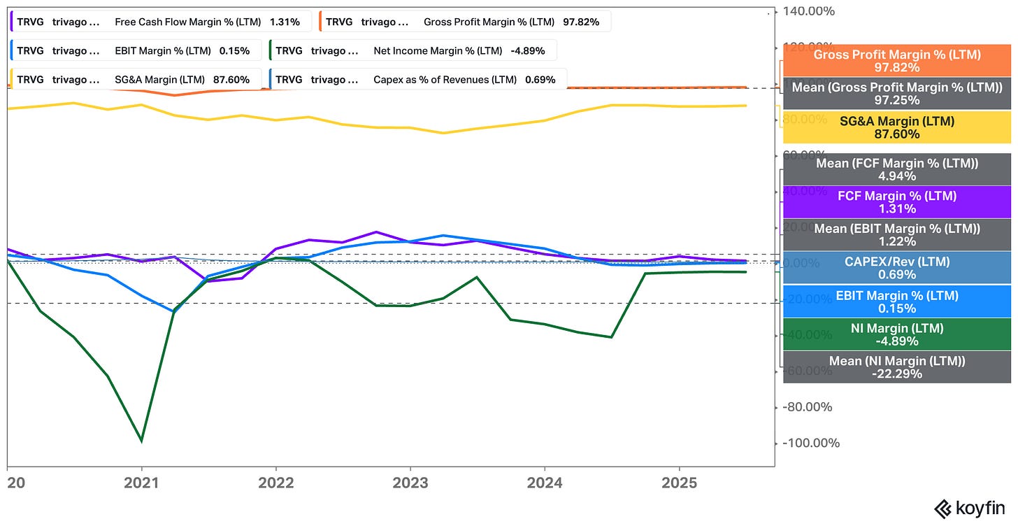 This chart is useful because it keeps me honest. It’s easy to get excited about high gross margins, but until SG&A and R&D moderate as a percentage of sales, operating margins will remain compressed. Consider this chart of trivago, for instance, where SG&A expenses represent almost 90% of revenue which is strongly tied to the business model: