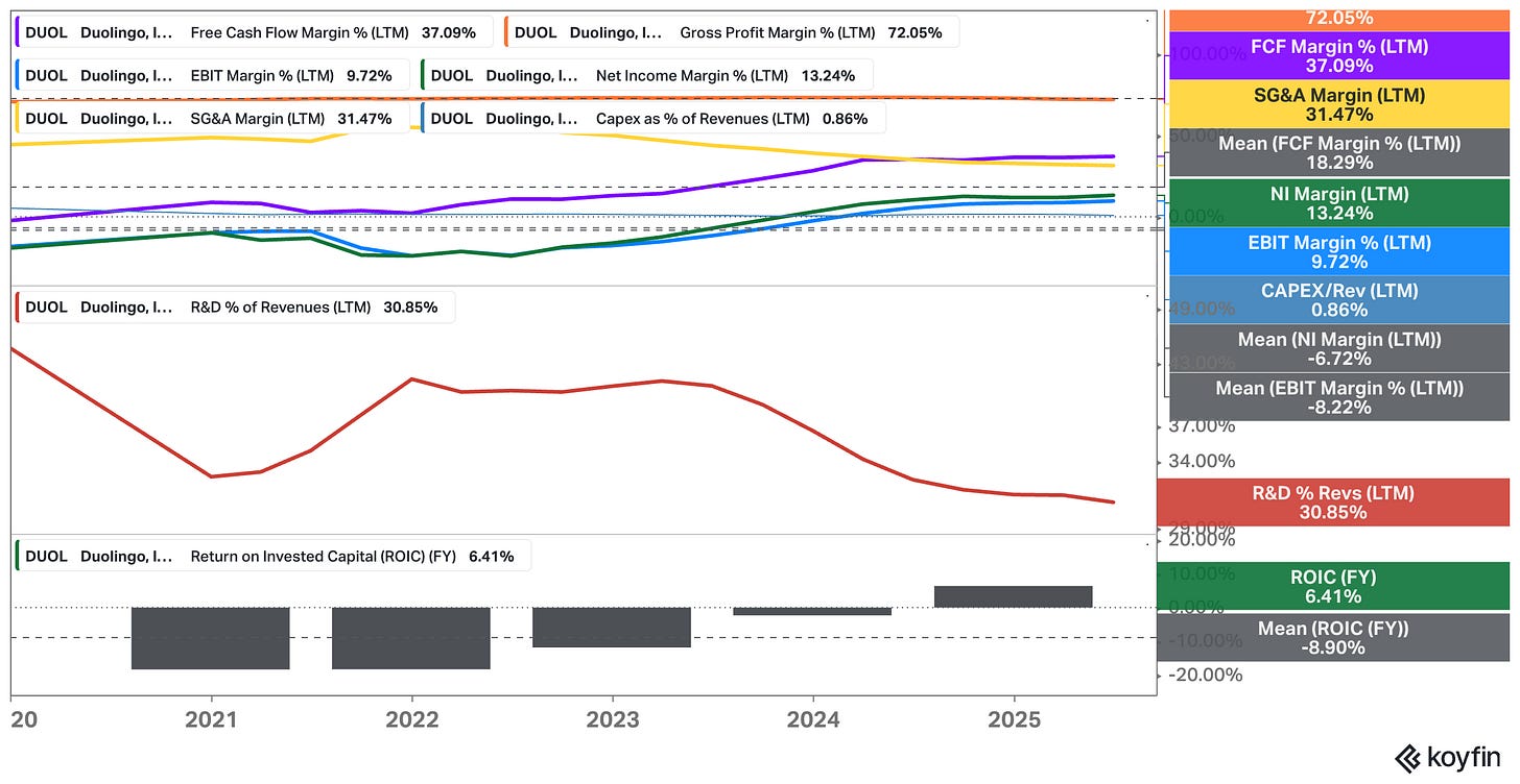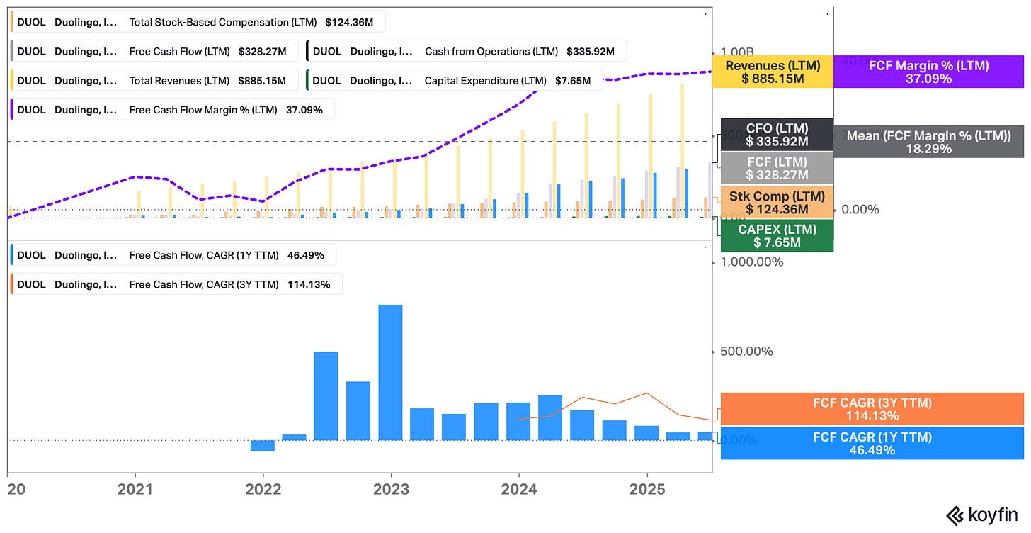 Looking at Duolingo, the story that jumps out is how clean the cash generation profile has become. Revenues are approaching $900 million, but what matters here is that cash from operations sits above $330 million, with capital expenditures of less than $8 million. That light CapEx burden is one of the defining features of Duolingo’s business model. It means that most of the cash flow is truly free, and not tied up in heavy reinvestment just to keep the lights on. The result is free cash flow margins north of 35% – roughly double the company’s own historical mean —> operating leverage at play.