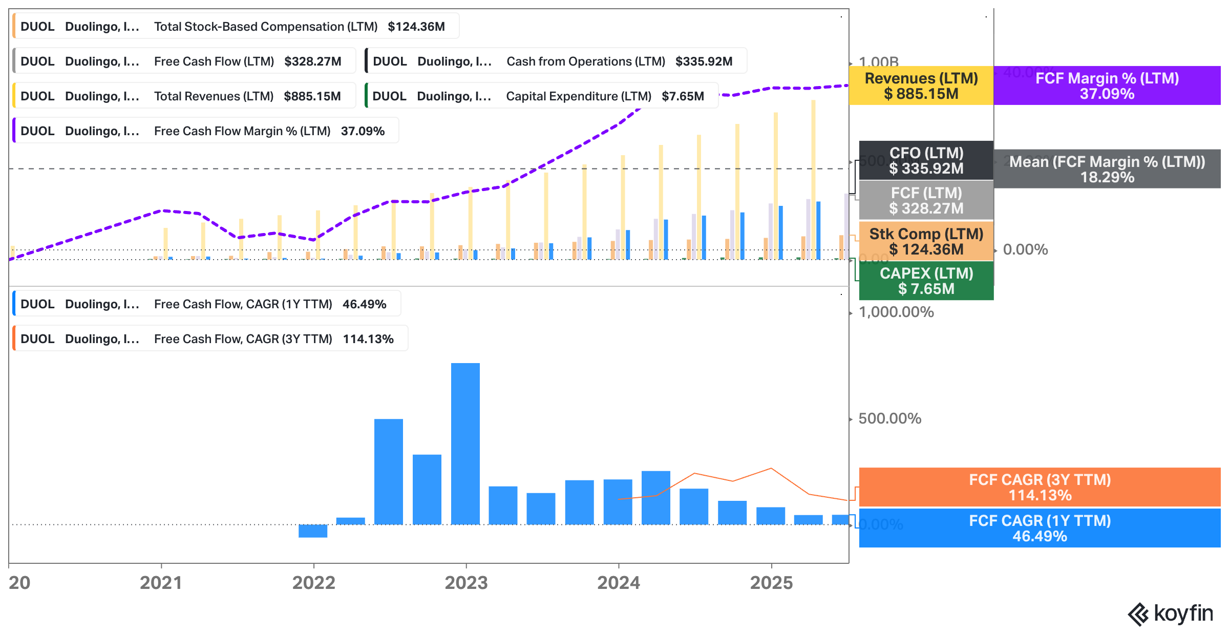 For Duolingo, the chart illustrates exactly why some investors are willing to pay a premium multiple: it’s a business that converts growth into cash at scale and the cash generation machine is growing.