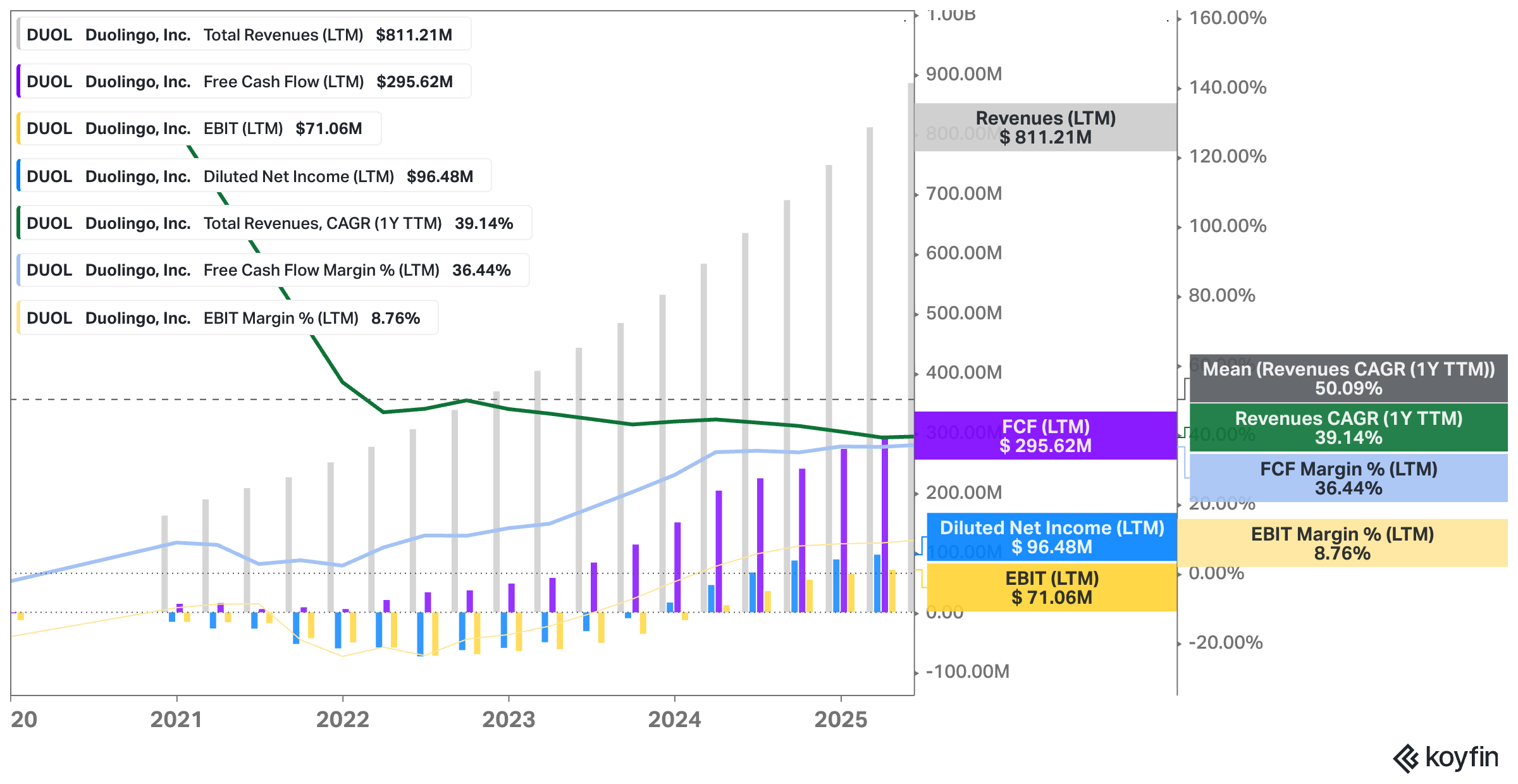 Take Duolingo. The company has scaled revenues to over $800 million on a trailing twelve-month basis, and the growth rate has been extraordinary – north of 40% YoY in most years, still 39% recently, and closer to 50% if you take the mean across the last couple of years; I find the “mean” statistical band a true game changer fwiw.
