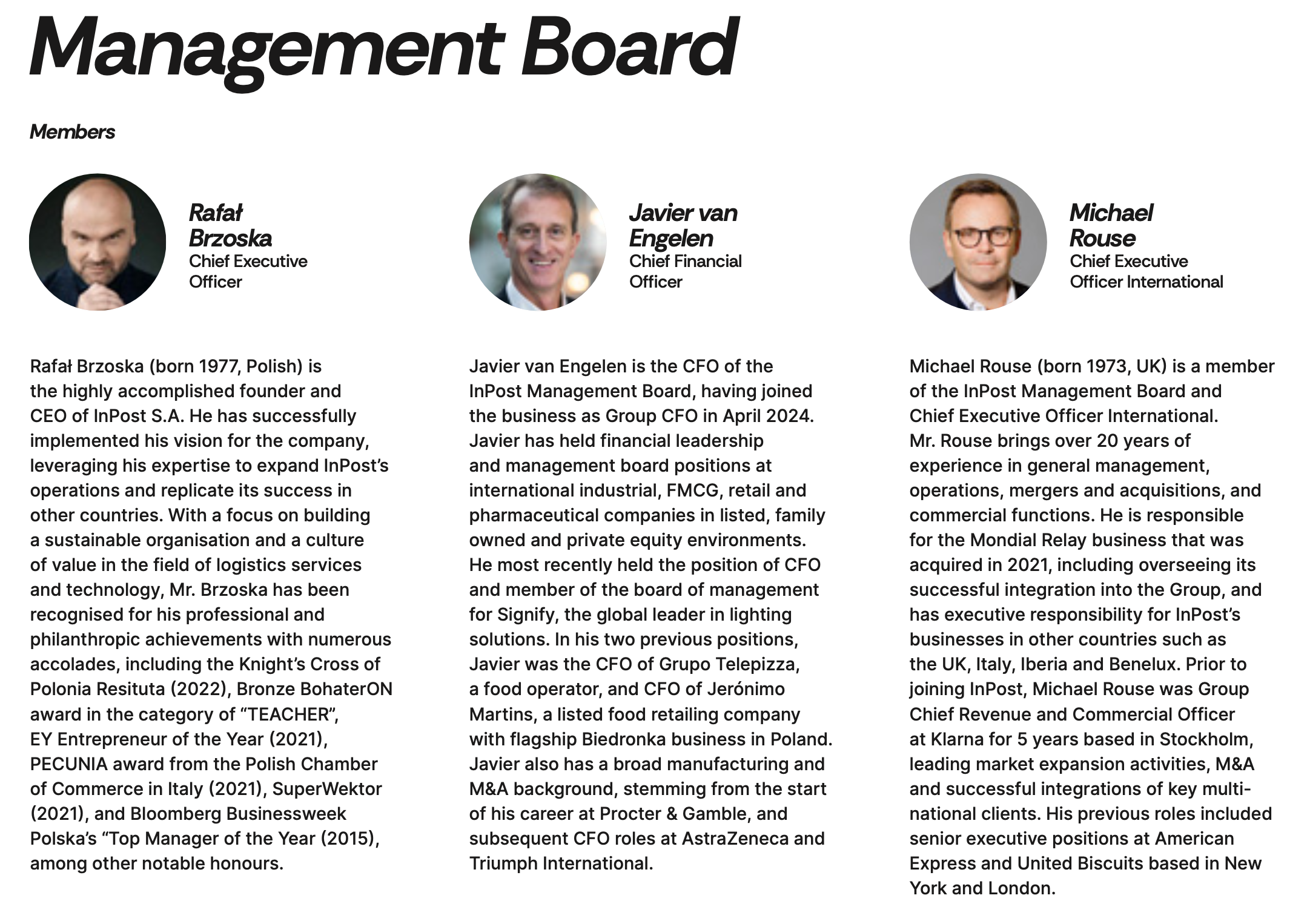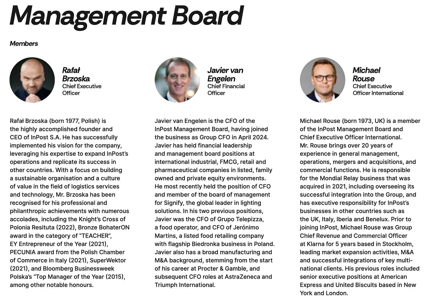 The second-largest shareholder is A&R Investments Ltd, owning 12.49% of the shares – this vehicle represents Rafał Brzoska, InPost’s founder and CEO, and reflects his significant continuing influence on the company’s strategic direction. At the IPO, it was reported that Brzoska controlled ~13% (of which ~1% directly, remainder via the A&R vehicle) so his total stake is probably around 13.5%.