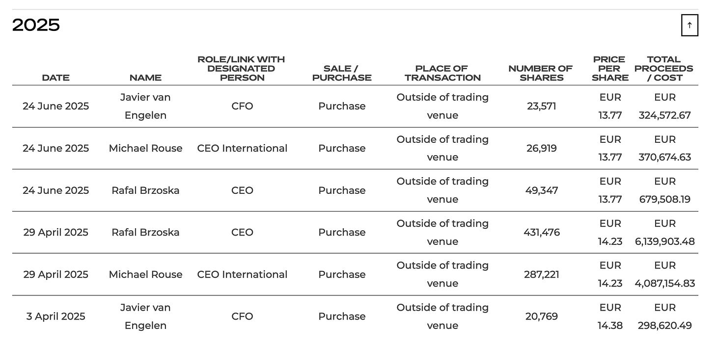 Finally, insider behavior supports that view. Recent filings show small but consistent insider purchases rather than sales (the €6 million purchase of Brzoska in April stands out), and no large disposals by senior management. The founder’s stake remains substantial, signaling long-term alignment. There’s no sign of insiders treating the current valuation as expensive – which, if anything, reinforces my sense that they still view the stock as undervalued relative to its normalized earnings power.