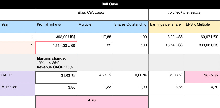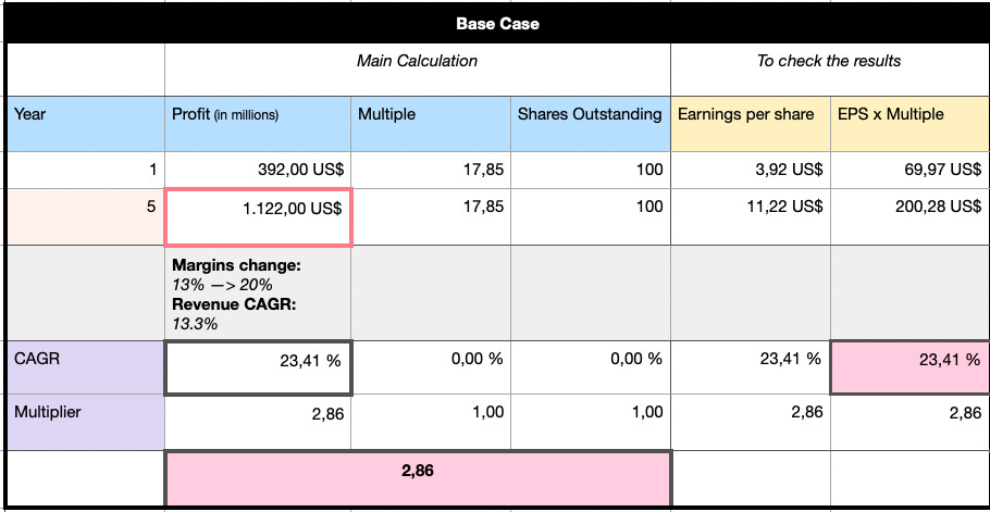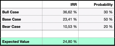 In the base case, revenue compounds at 13% per year (which feels conservative to be fair), margins climb more modestly from 13% to 20%, and the valuation multiple stays flat at around 17.8x EBIT. That combination results in operating profit of roughly €1.1 billion by year five and an expected annualized return of about 23%. It’s a balanced view that assumes solid execution without heroics – Poland remains dominant, international markets become more profitable and drive growth.