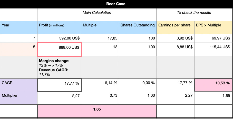 In the bear case, the picture is more muted. Revenue growth slows to just under 12% annualized over five years, margins improve only slightly from the current level to 17%, and the market de-rates the stock to a 13x multiple as competition bites and expansion stalls, or maybe the market is just not excited about InPost at that time. Even under those conditions, profits still grow to roughly €0.9 billion, translating to a 10.5% annualized stock return. In other words, the downside is not catastrophic – just mediocre compounding.