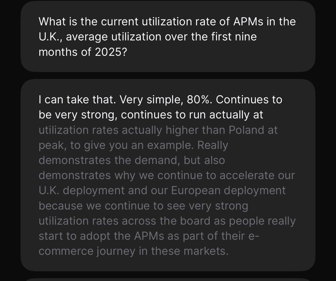 “But clearly, we are working today in all those international markets with a legacy mixture PUDO business through sort of asset-light strategy and acquisition. And clearly, there’s also a unit economic advantage of converting from a legacy PUDO parcel rate to an APM rate where we don’t have that cost apart from, obviously, the CapEx and then we sweat that asset.“ - Q2 25 Call