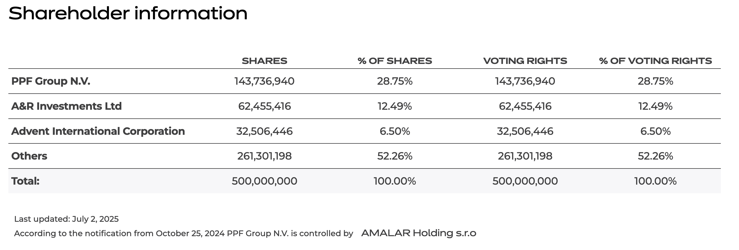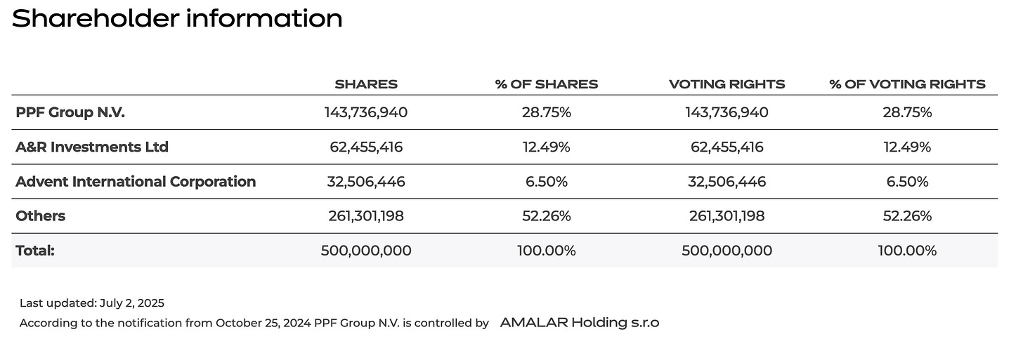 As of July 2025, InPost’s shareholder base remains anchored by three major investors. The largest is PPF Group N.V., which holds 28.75% of the company’s shares and voting rights. PPF, controlled by AMALAR Holding s.r.o., is a Czech investment group with a diverse portfolio spanning telecom, finance, and logistics assets across Europe.