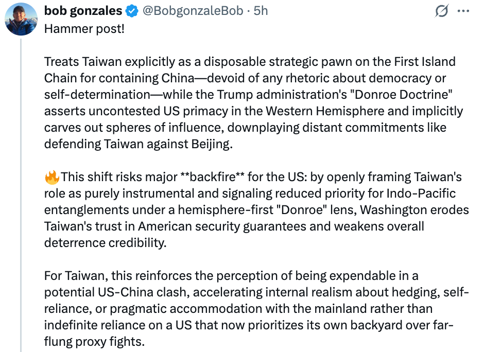 In such a world, Taiwan’s strategic value to the US would not disappear, but it would diminish. And if that happens, the implicit bargain between Washington and Beijing could shift. I don’t know if or when this scenario materializes. But it is hard to ignore the sense that there is a quiet race underway: China trying to reduce its technological dependence on the West, and the US trying to reduce its dependence on Taiwan. If both succeed partially, Taiwan’s unique position in the global system weakens. At that point, the idea of a “peaceful transition” stops being a moral question and starts (almost) becoming a strategic “win-win proposition.”