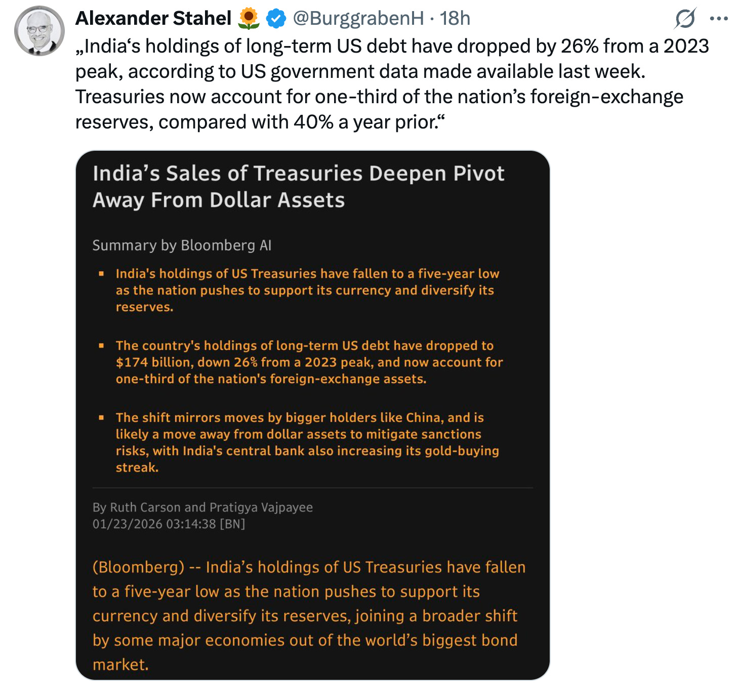 You see it in the gradual shift of reserve assets, where China – just like some Scandinavian pension funds recently –, has been reducing its holdings of US Treasuries while increasing gold reserves.