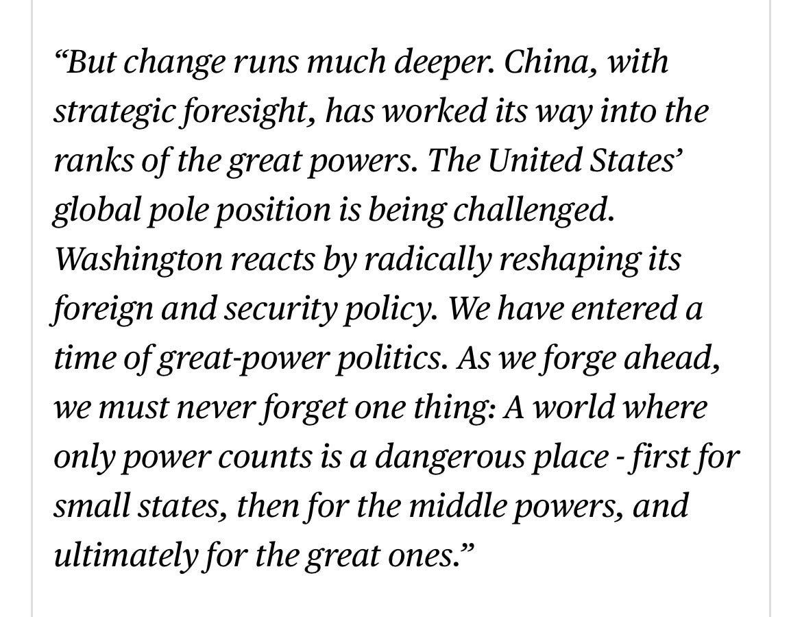 “Today I will talk about a rupture in the world order, the end of a pleasant fiction and the beginning of a harsh reality, where geopolitics, where the large, main power, geopolitics, is submitted to no limits, no constraints. [...] It seems that every day we’re reminded that we live in an era of great power rivalry, that the rules based order is fading, that the strong can do what they can, and the weak must suffer what they must. And this aphorism of Thucydides is presented as inevitable, as the natural logic of international relations reasserting itself. And faced with this logic, there is a strong tendency for countries to go along to get along, to accommodate, to avoid trouble, to hope that compliance will buy safety.