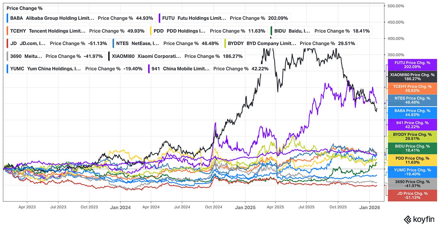 Then there are individual stocks. When you overlay the performance of major Chinese names over the past few years, the dispersion is striking. Some stocks have compounded spectacularly, others have stagnated or declined. This is not a market moving in lockstep with a single macro narrative. It is a market where company-specific fundamentals still matter, even if they are constantly filtered through a geopolitical lens.