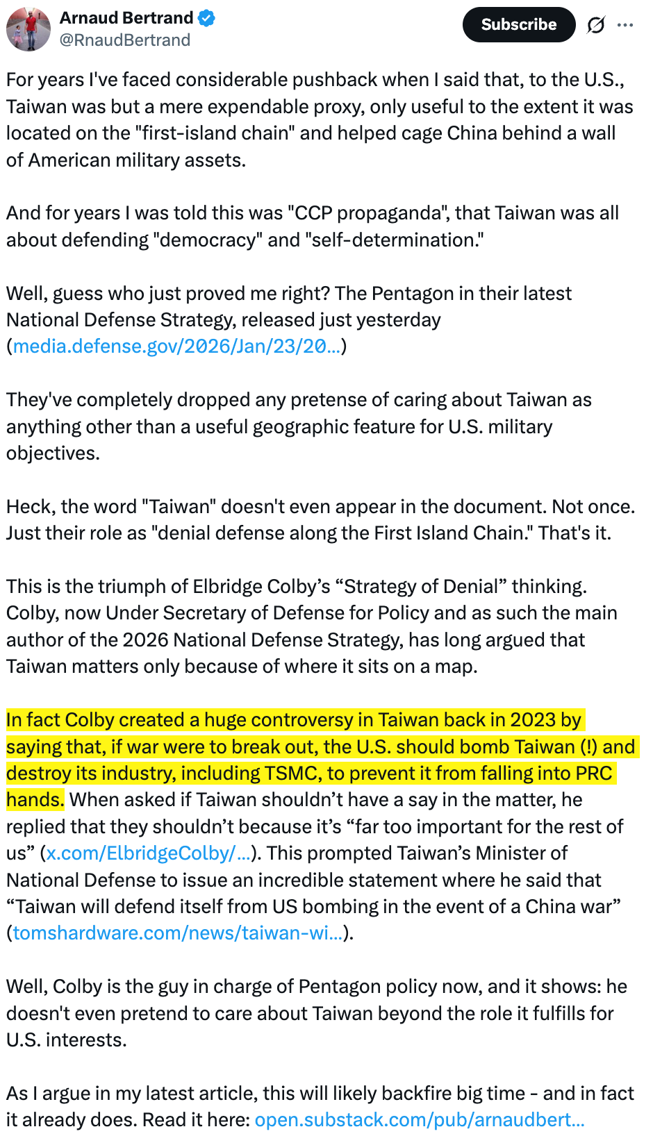 And I agree, even though I will say it’s always hard to assess this objectively as someone living in the West with no boots on the ground. Historically, the Taiwan issue is more ambiguous than it is often portrayed. Taiwan’s status after World War II emerged from an unusual combination of Allied wartime declarations, the outcome of China’s civil war, and decades of geopolitical bargaining between Beijing and Washington. The People’s Republic of China has always considered Taiwan part of its territory, while the United States has maintained a deliberately ambiguous position, recognising Beijing diplomatically but committing itself to Taiwan’s defence in practice. This ambiguity is not an accident. It has been a stabilising mechanism for decades.