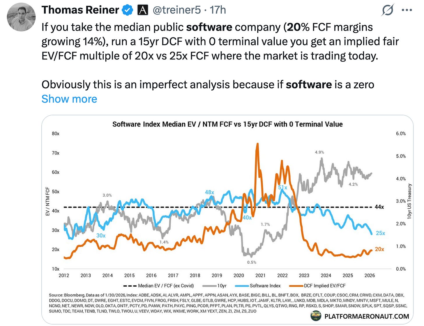 The current sell-off in software feels dramatic, but it is not irrational. AI agents really are changing the tail risk profile of many software stocks. Thomas Reiner highlighted in the tweet below how a business growing 14% over the next 15 years (far exceeding base rates) is “only” worth 20-25x FCF.