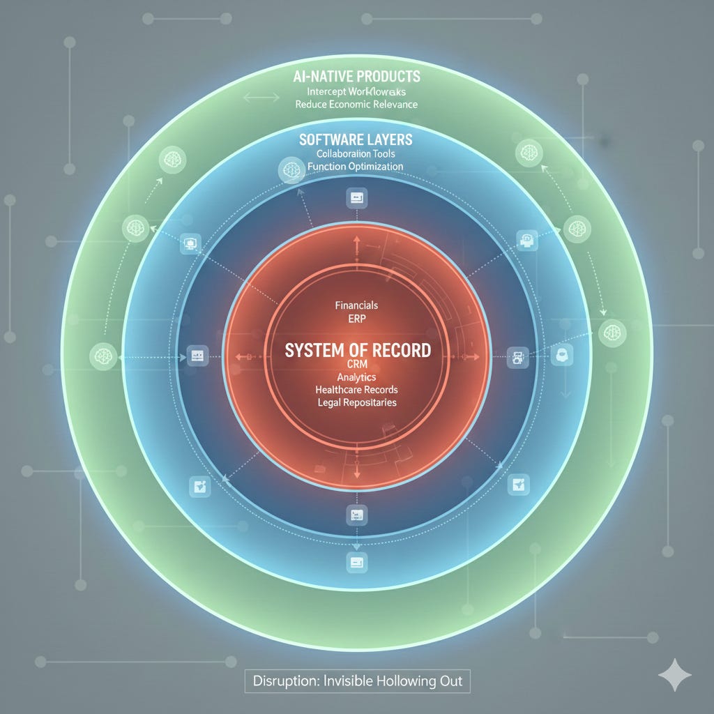 The system of record (defined in part 1)) defines the first layer. It is where information accumulates over time, where institutional memory is stored, and where organizational truth is encoded. Replacing such a system is difficult because it requires rewriting history. But most disruption does not start there.