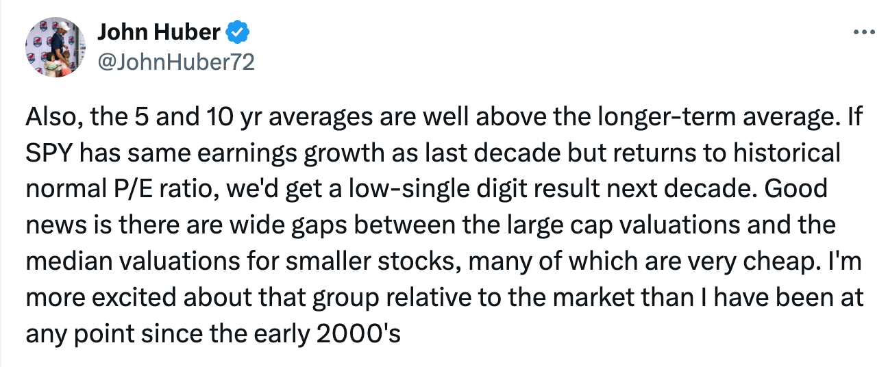 John Huber, an investor I respect greatly, recently highlighted on X (formerly Twitter) that if the S&P 500 were to revert to a more historically normal P/E ratio, it could lead to low single-digit returns over the next decade, even if earnings growth remains robust. This points to a potential headwind for the broad market, where even solid earnings growth might not translate into strong returns if multiples contract.
