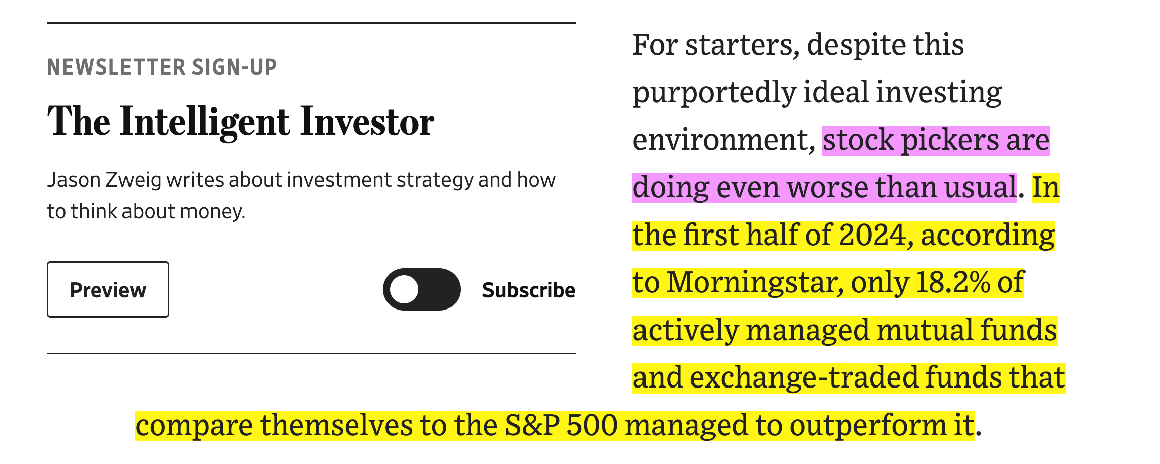 That said, despite this growing divergence, most active fund managers continue to underperform. A statistic from Jason Zweig of the Wall Street Journal highlights that only 18% of actively managed funds beat the S&P 500 in the first half of 2024.