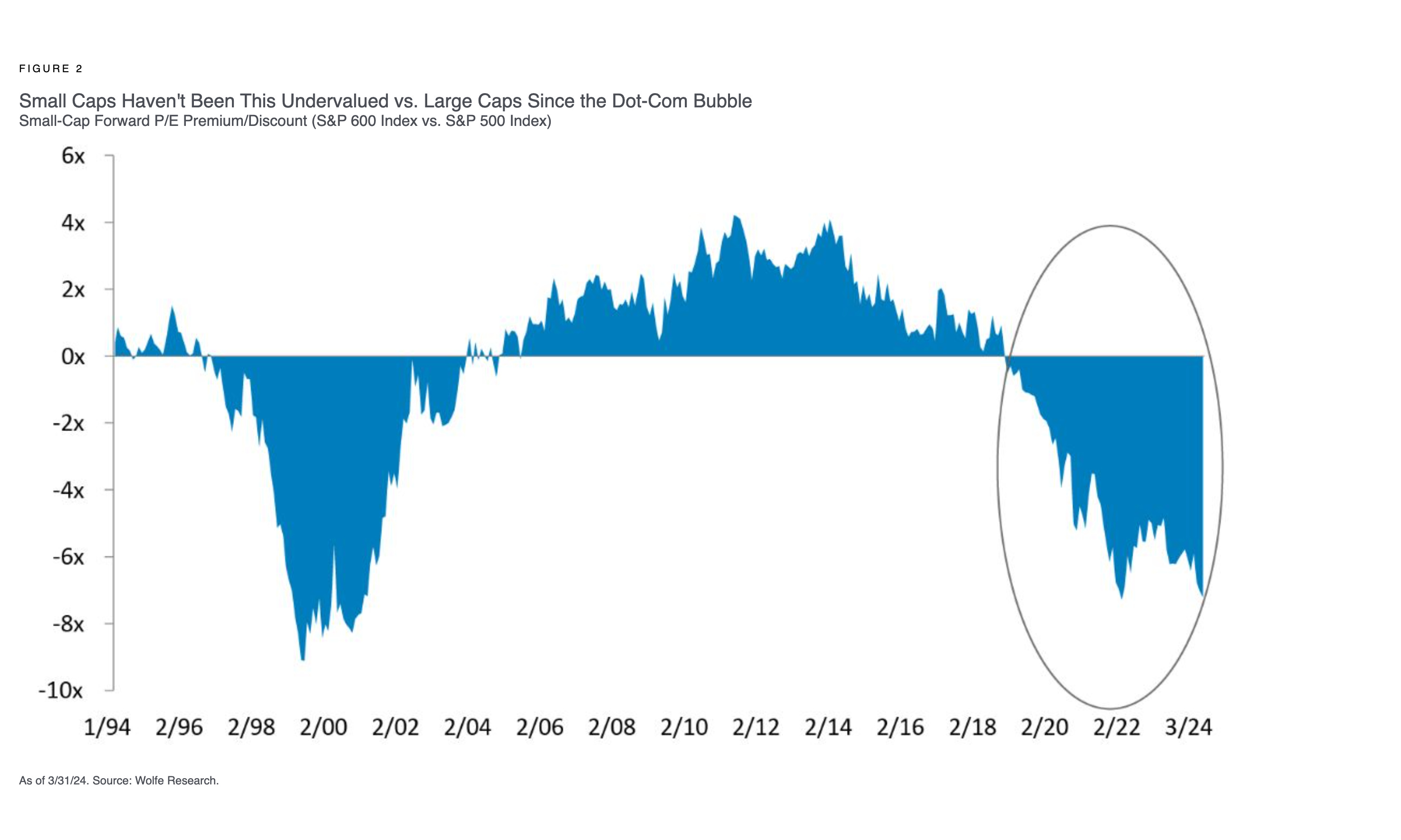 However, as Huber points out, there’s a silver lining—there’s a significant gap between large-cap valuations and those of smaller stocks, many of which are trading at much more attractive multiples …