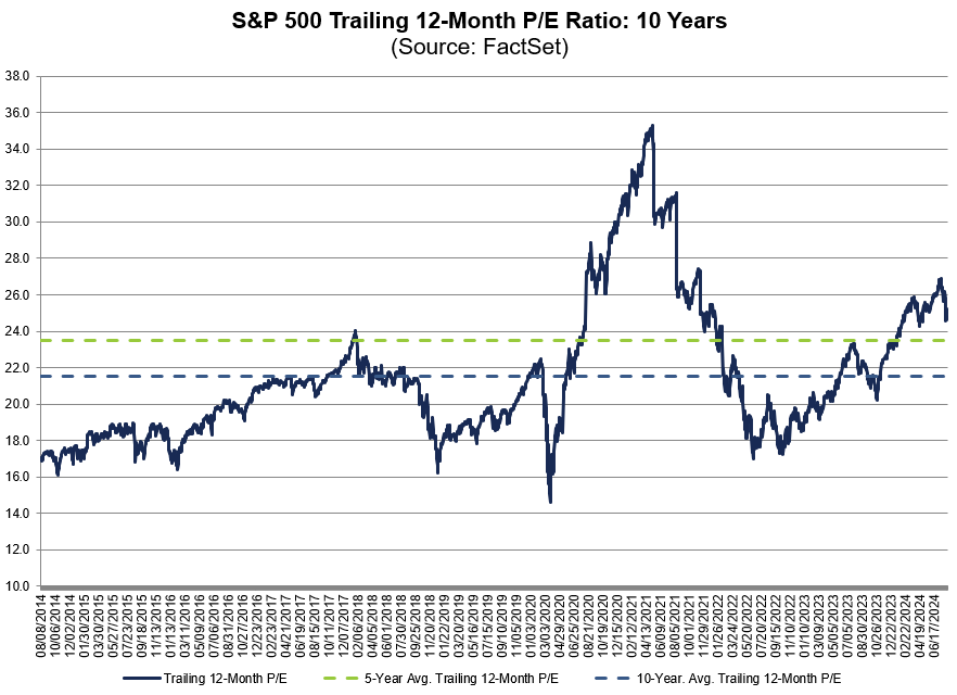The current valuation of the S&P 500 also warrants a closer look. The trailing 12-month price-to-earnings (P/E) ratio is around 25x, which is above both the 5-year average of 23.5x and the 10-year average of 21.5x. This is well above the long-term historical median of around 15x, indicating that the market is expensive by historical standards.