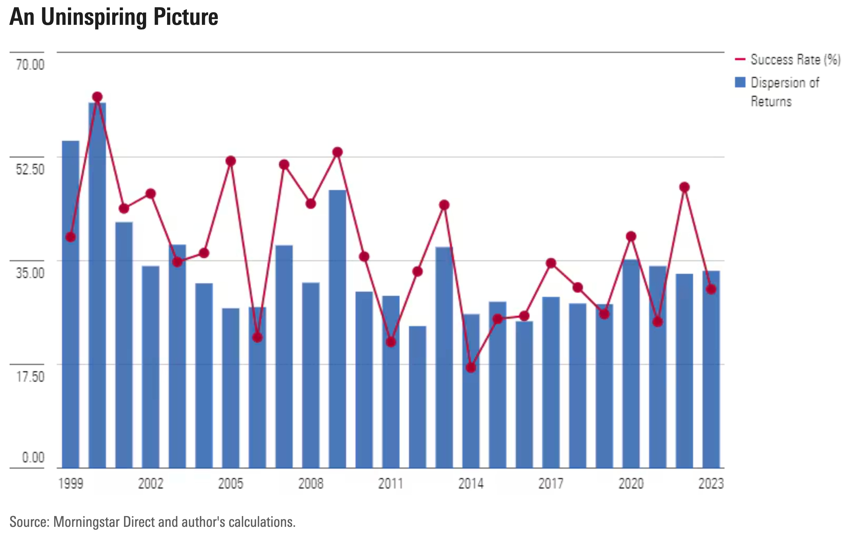 And according to another Morningstar data point, over the past decade, only about 27% of fund managers have outperformed their benchmark index.